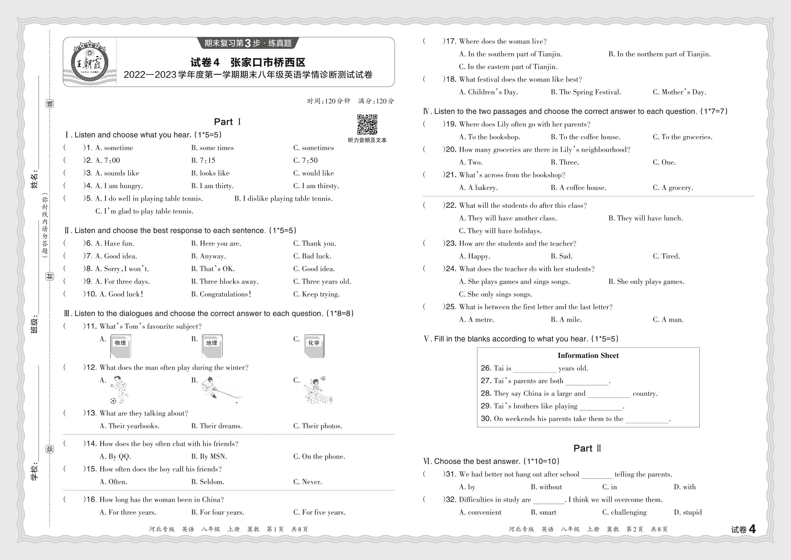 河北省张家口市桥西区2022—2023学年度第一学期期末八年级英语学情诊断测试试卷(冀教版)【4】
