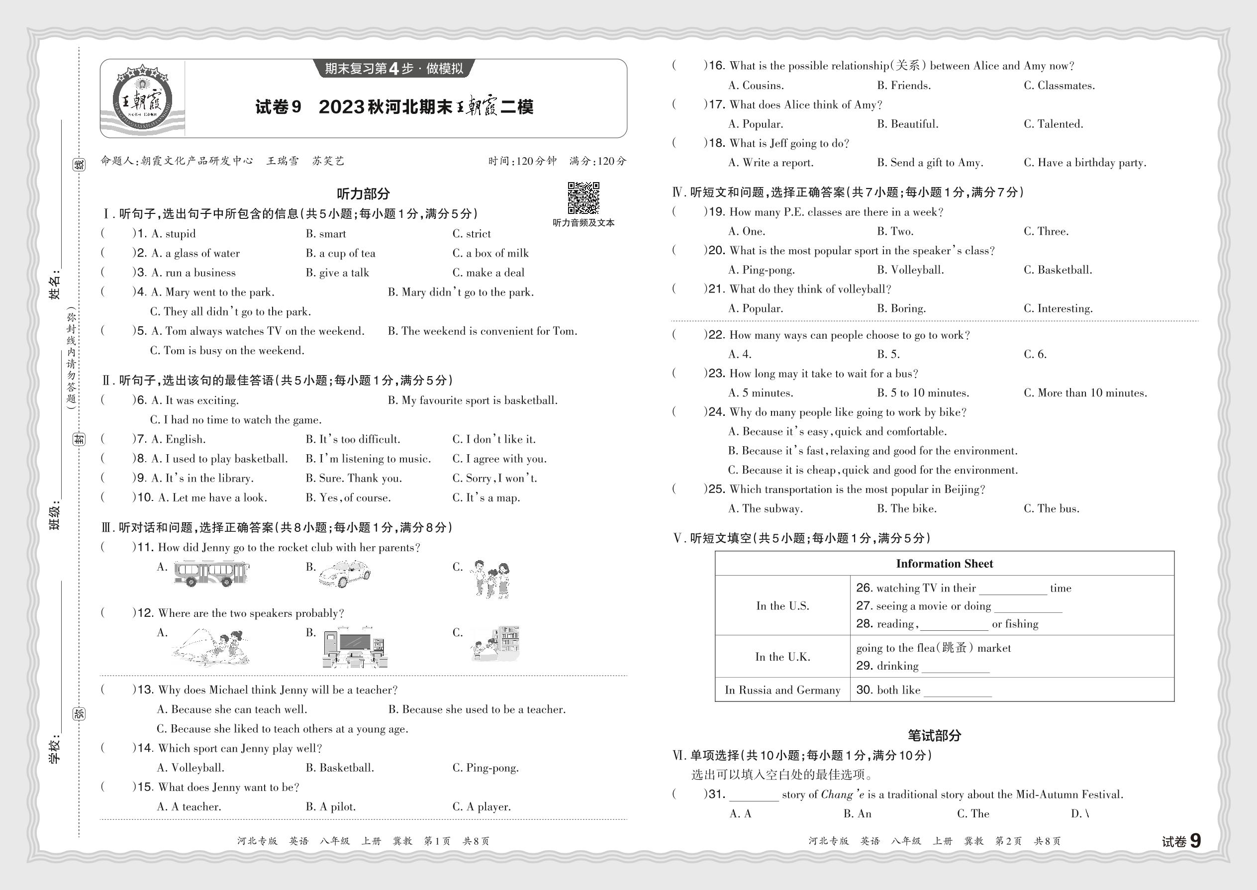 2023秋上册八年级英语冀教版 河北期末王朝霞二模