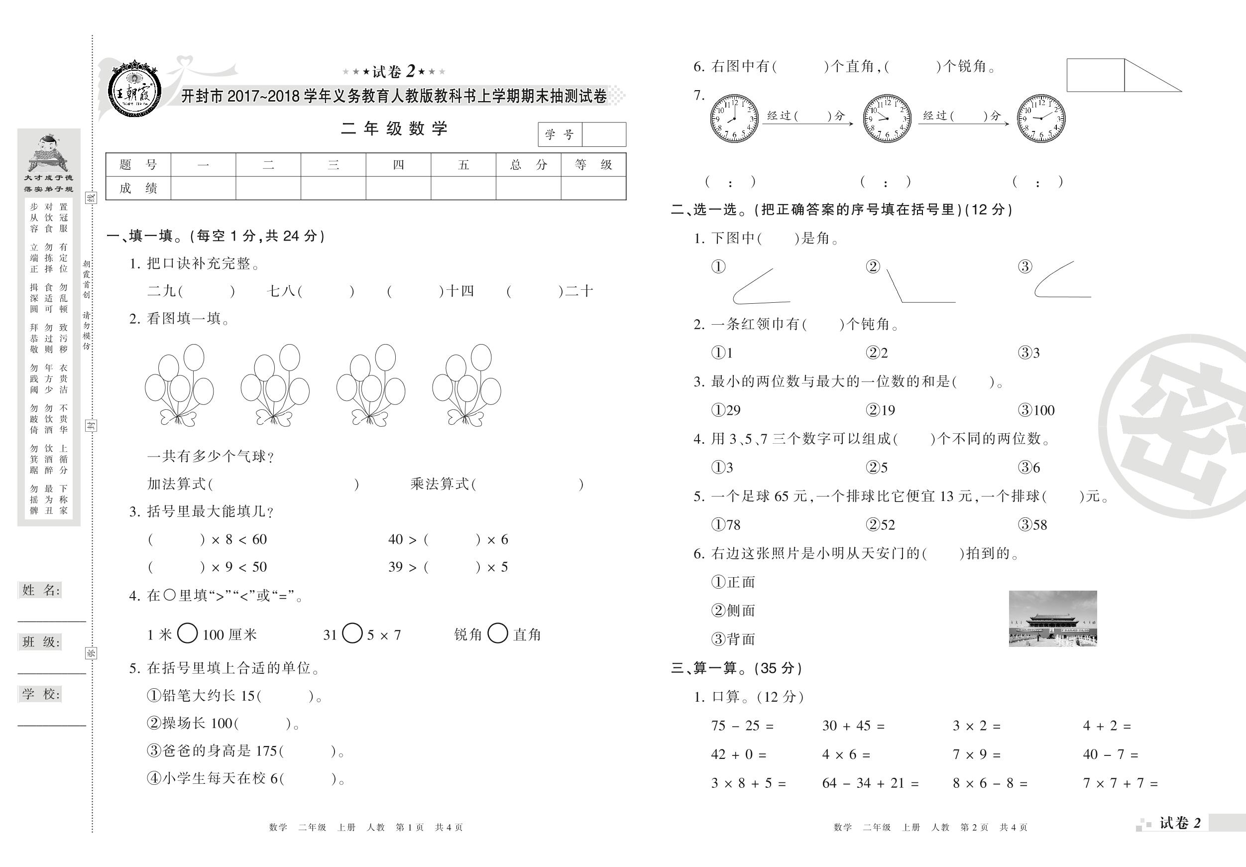 2017-2018学年第一学期开封市二年级数学试卷(人教版)【2】