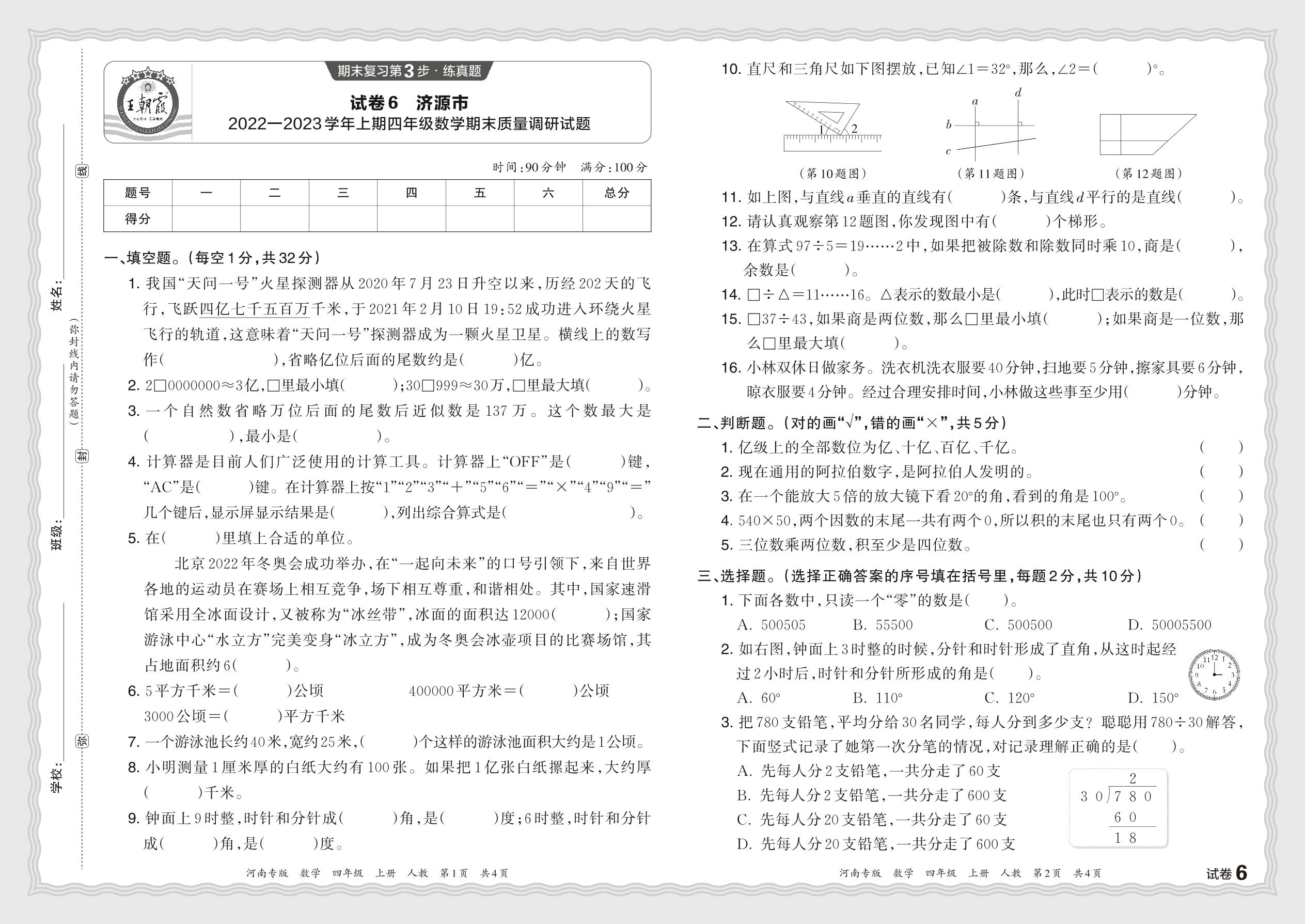 河南省济源市2022—2023学年上学期四年级数学期末质量调研试题(人教版)【6】