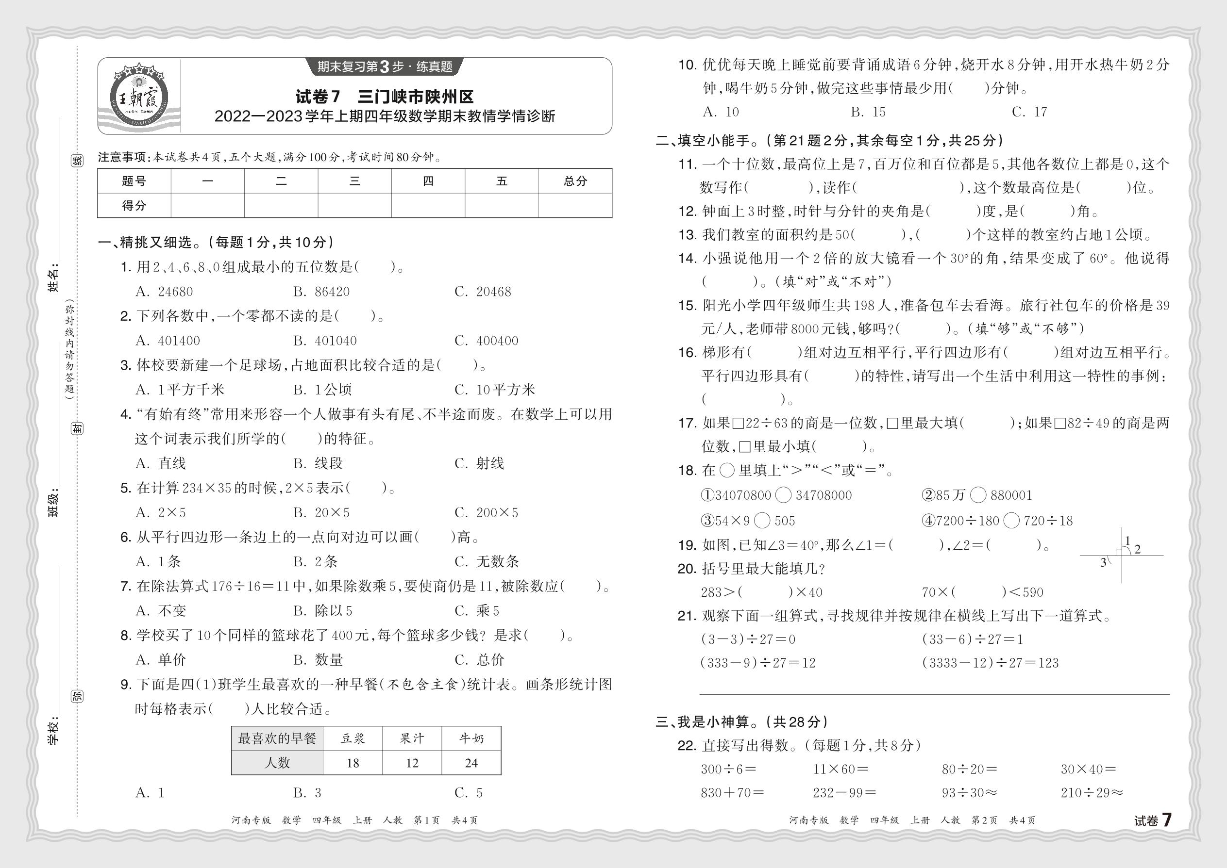 河南省三门峡市陕州区2022—2023学年上学期四年级数学期末教情学情诊断(人教版)【7】