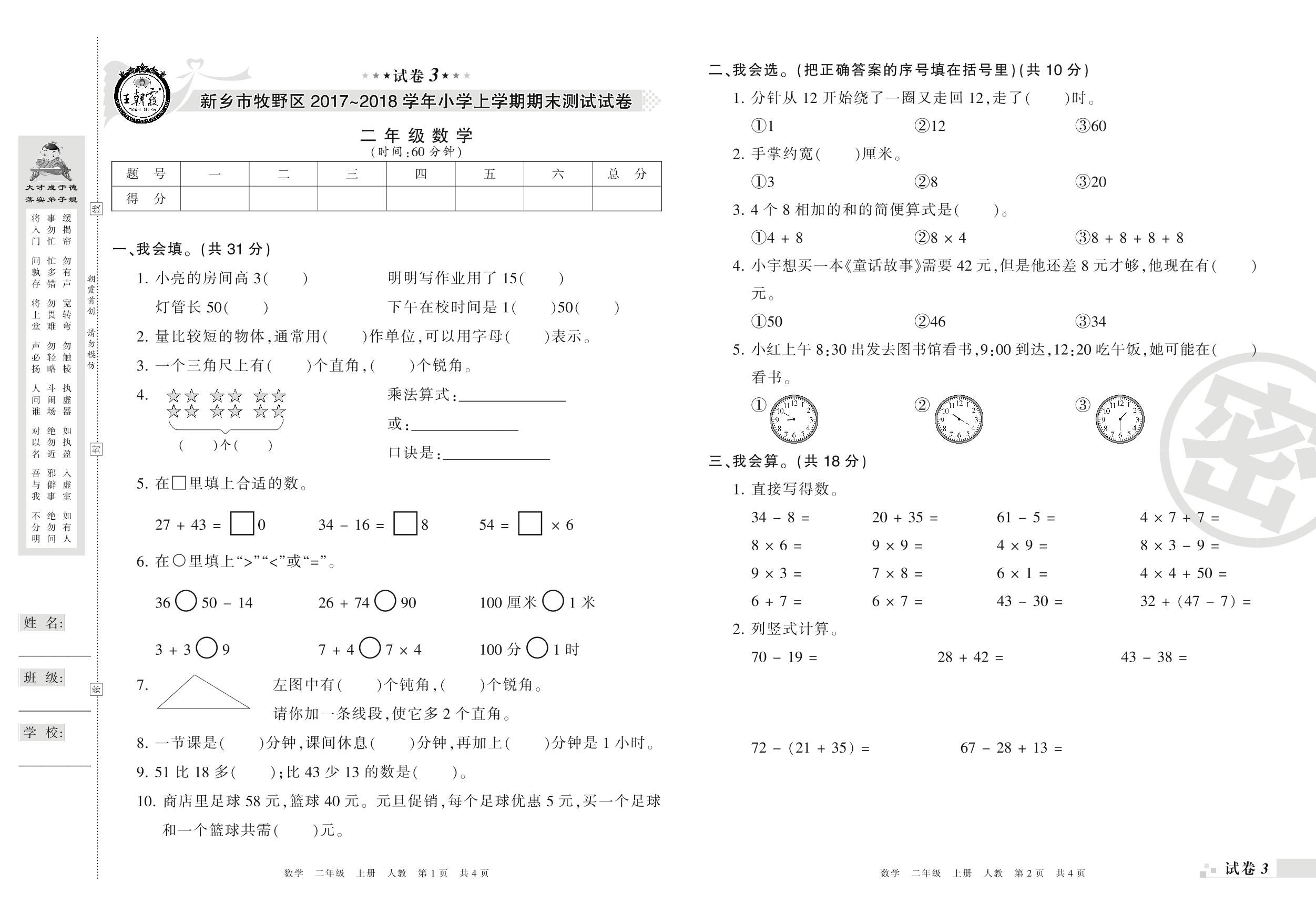 2017-2018学年第一学期新乡市牧野区二年级数学试卷(人教版)【3】