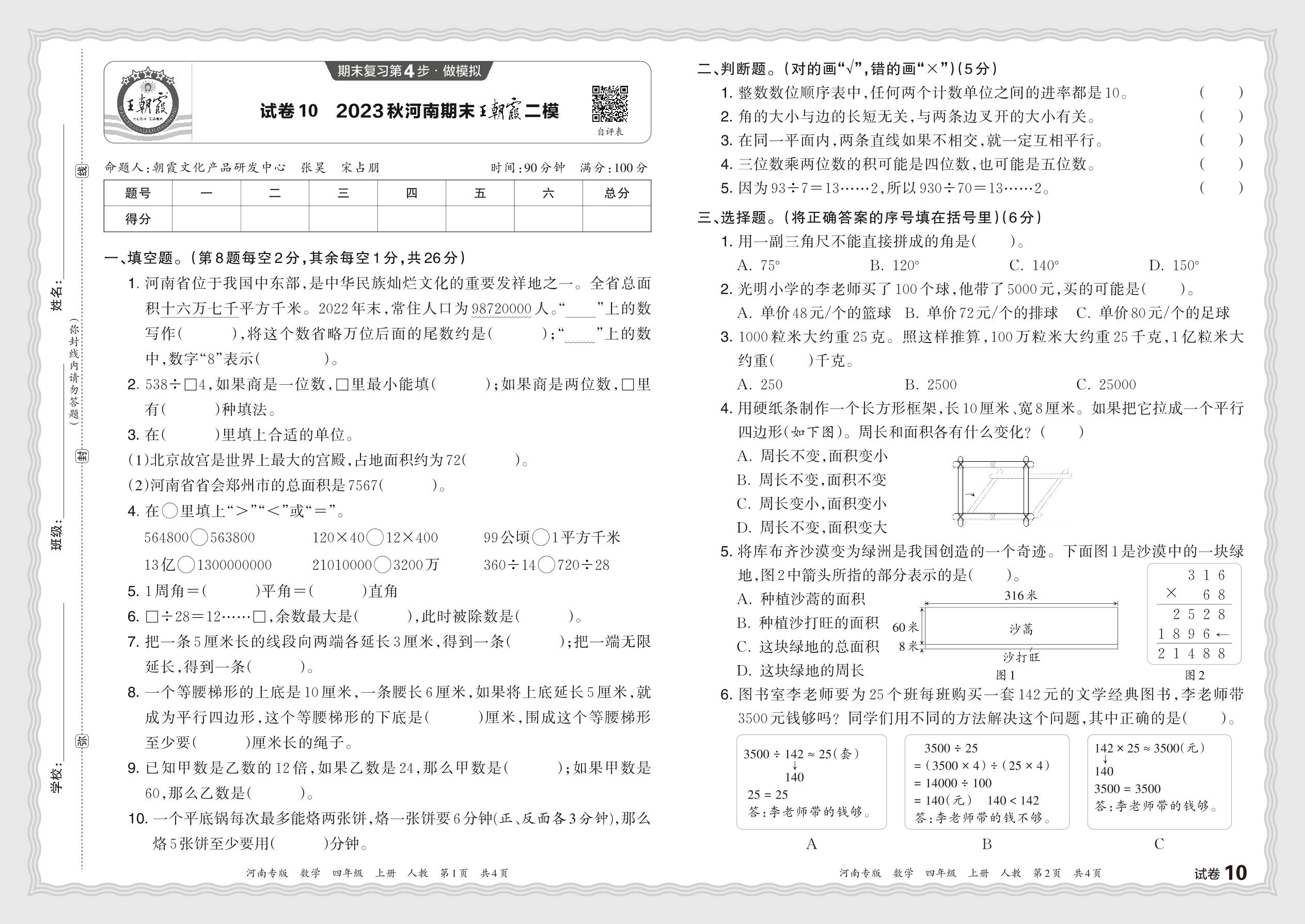2023秋上册四年级数学人教版 河南期末王朝霞二模【10】