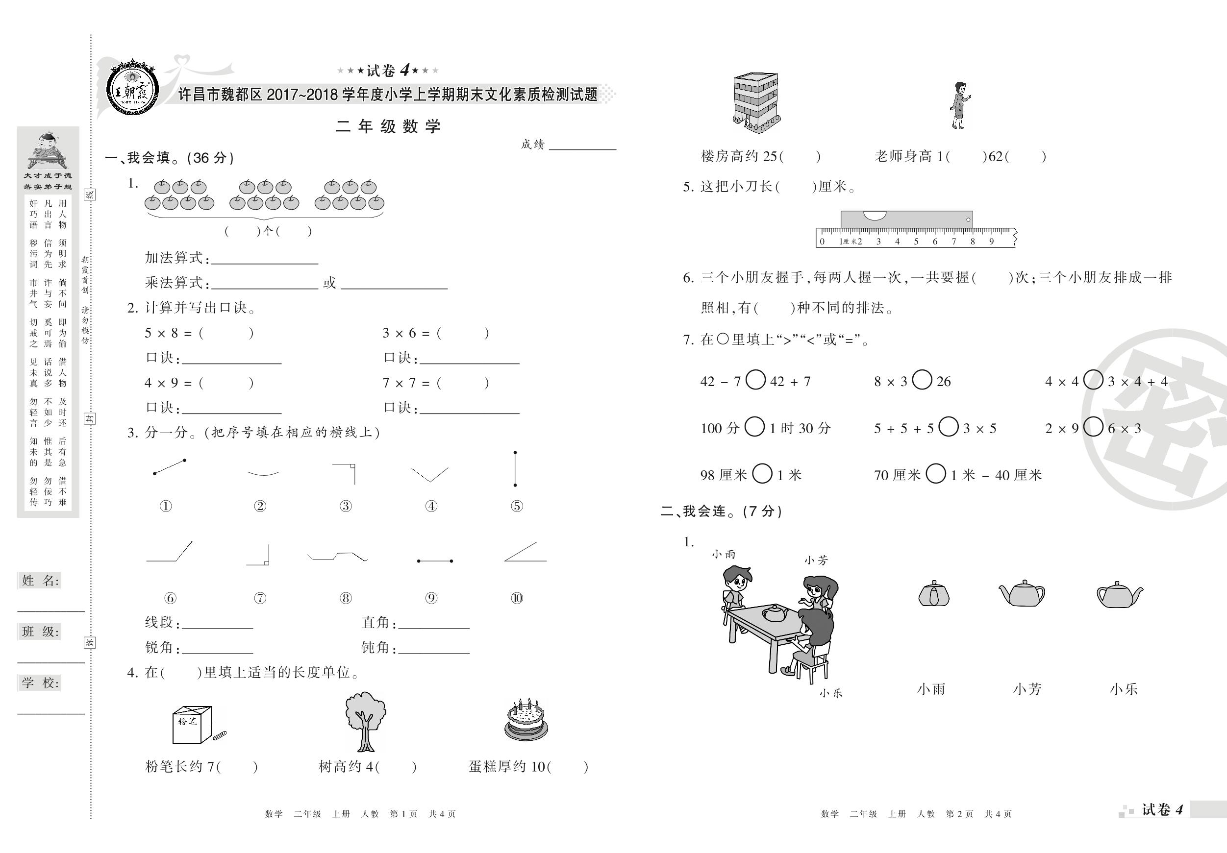 2017-2018学年第一学期许昌市魏都区二年级数学试卷(人教版)【4】