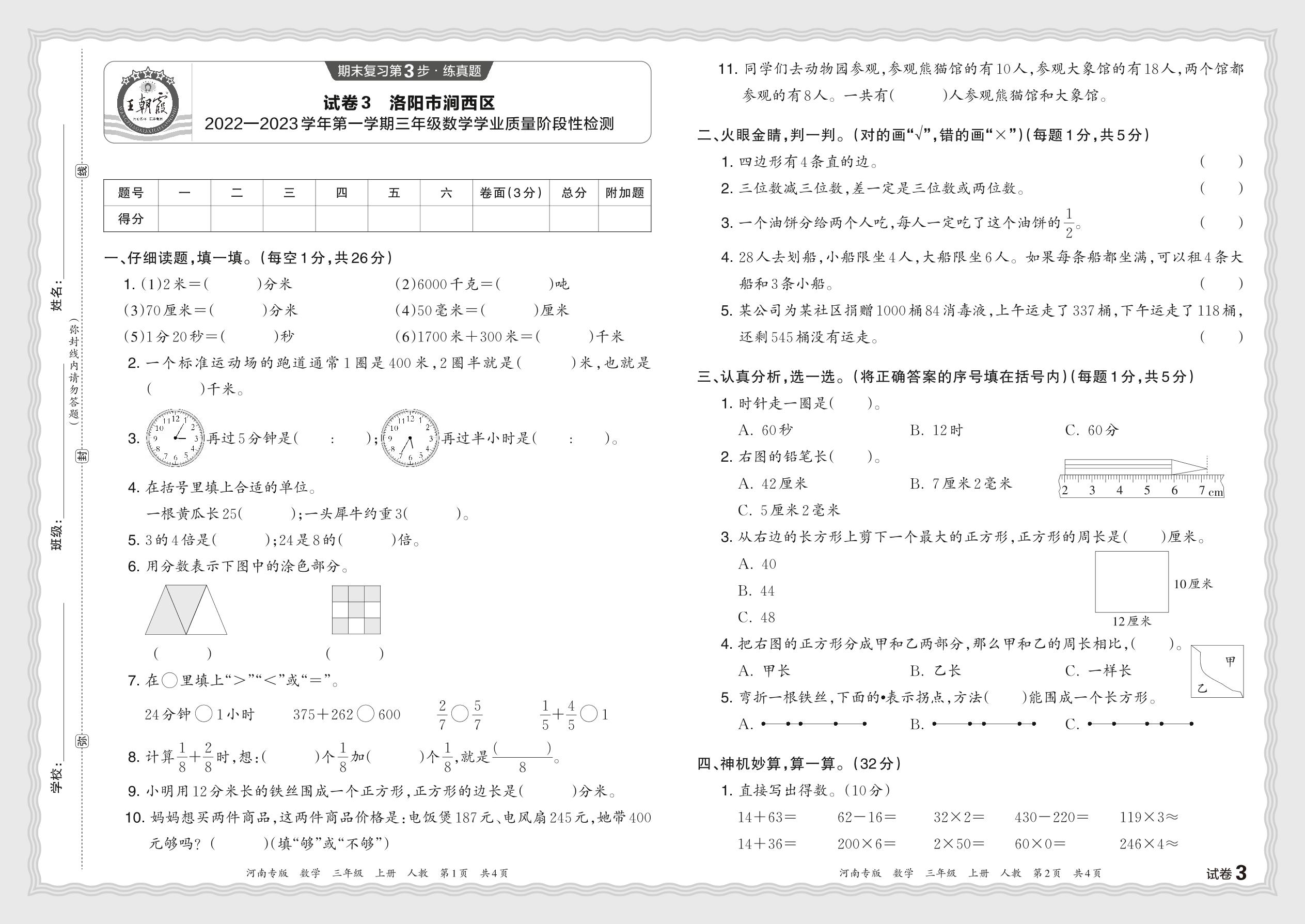 河南省洛阳市涧西区2022—2023学年第一学期三年级数学学业质量阶段性检测(人教版)【3】