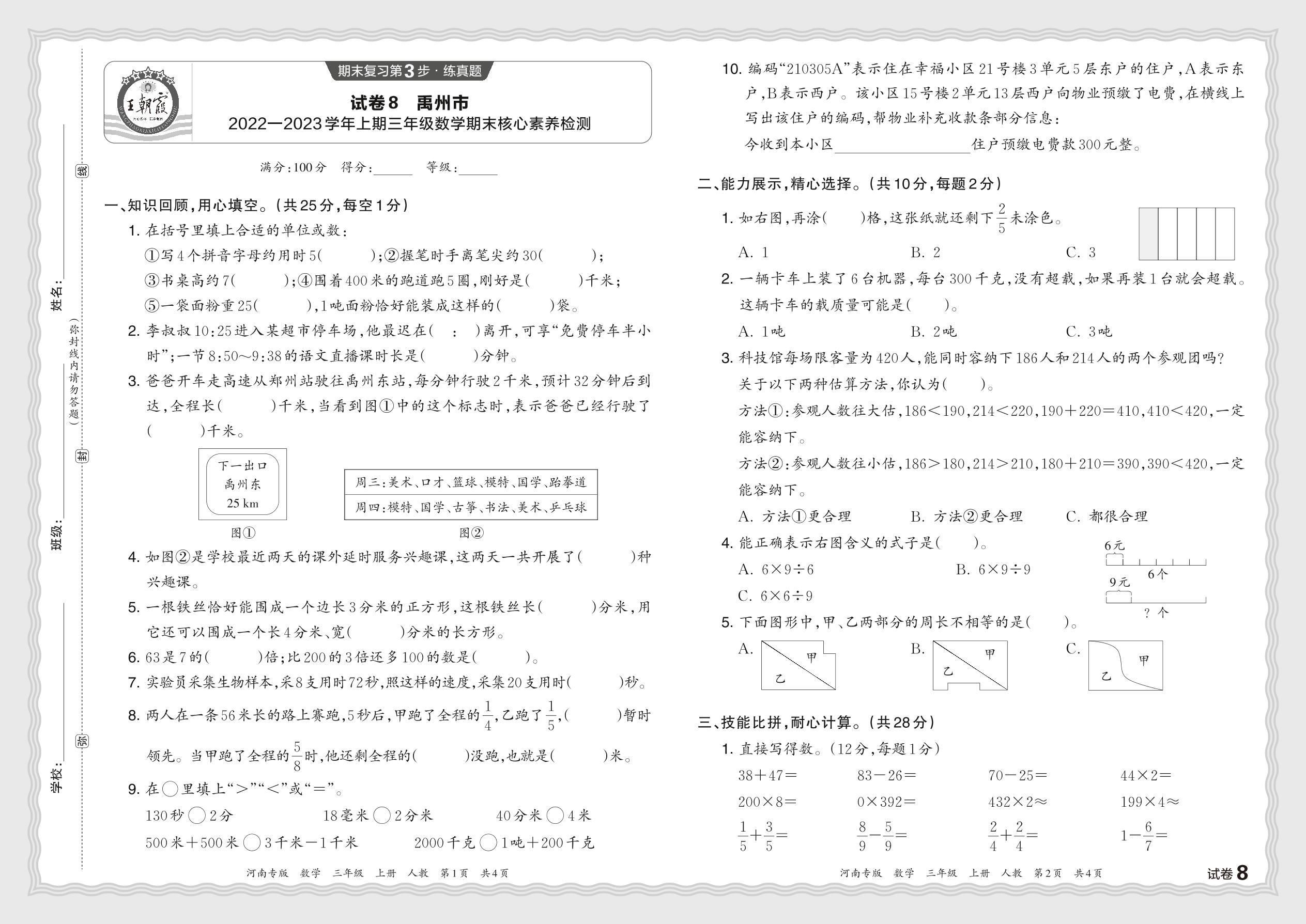 河南省禹州市2022—2023学年上期三年级数学期末核心素养检测(人教版)【8】