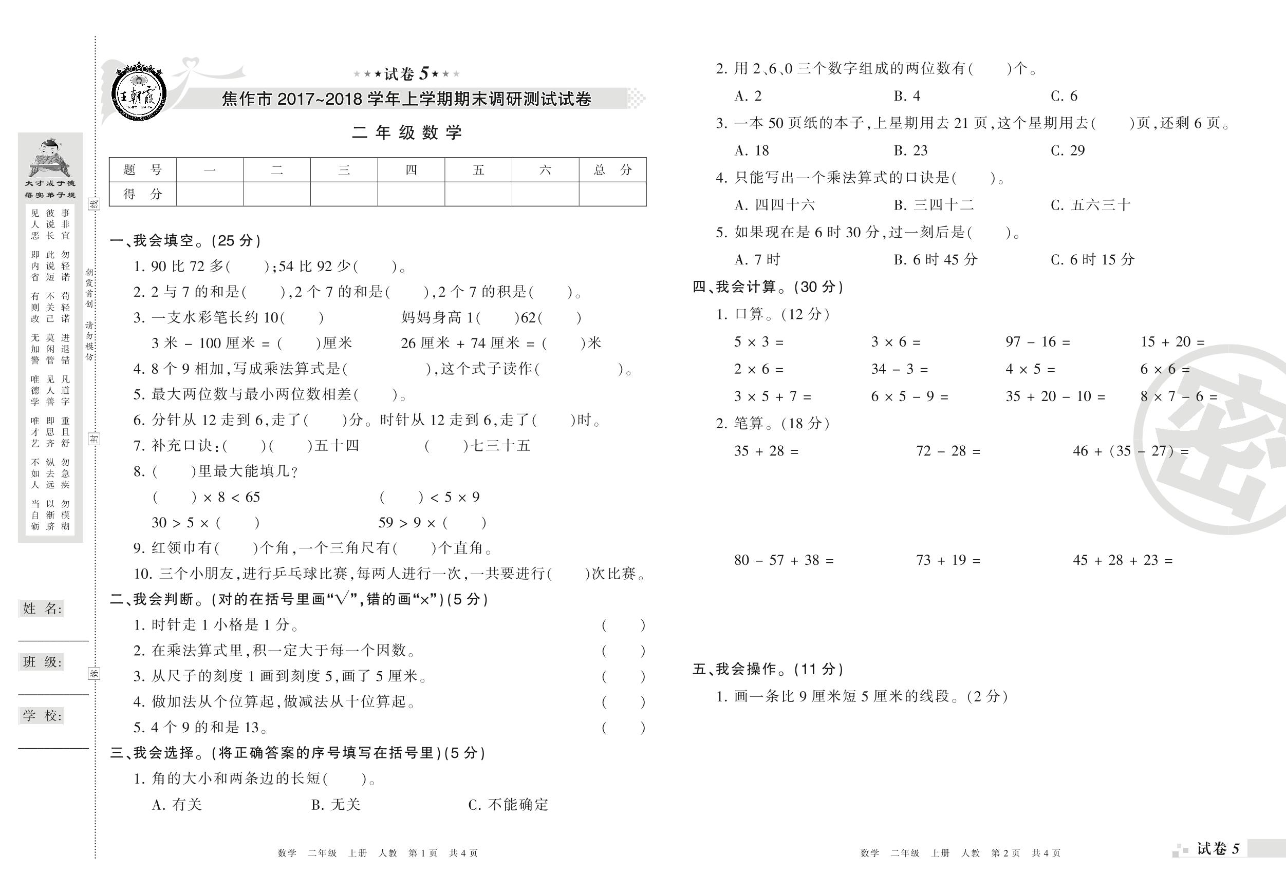 2017-2018学年第一学期焦作市二年级数学试卷(人教版)【5】