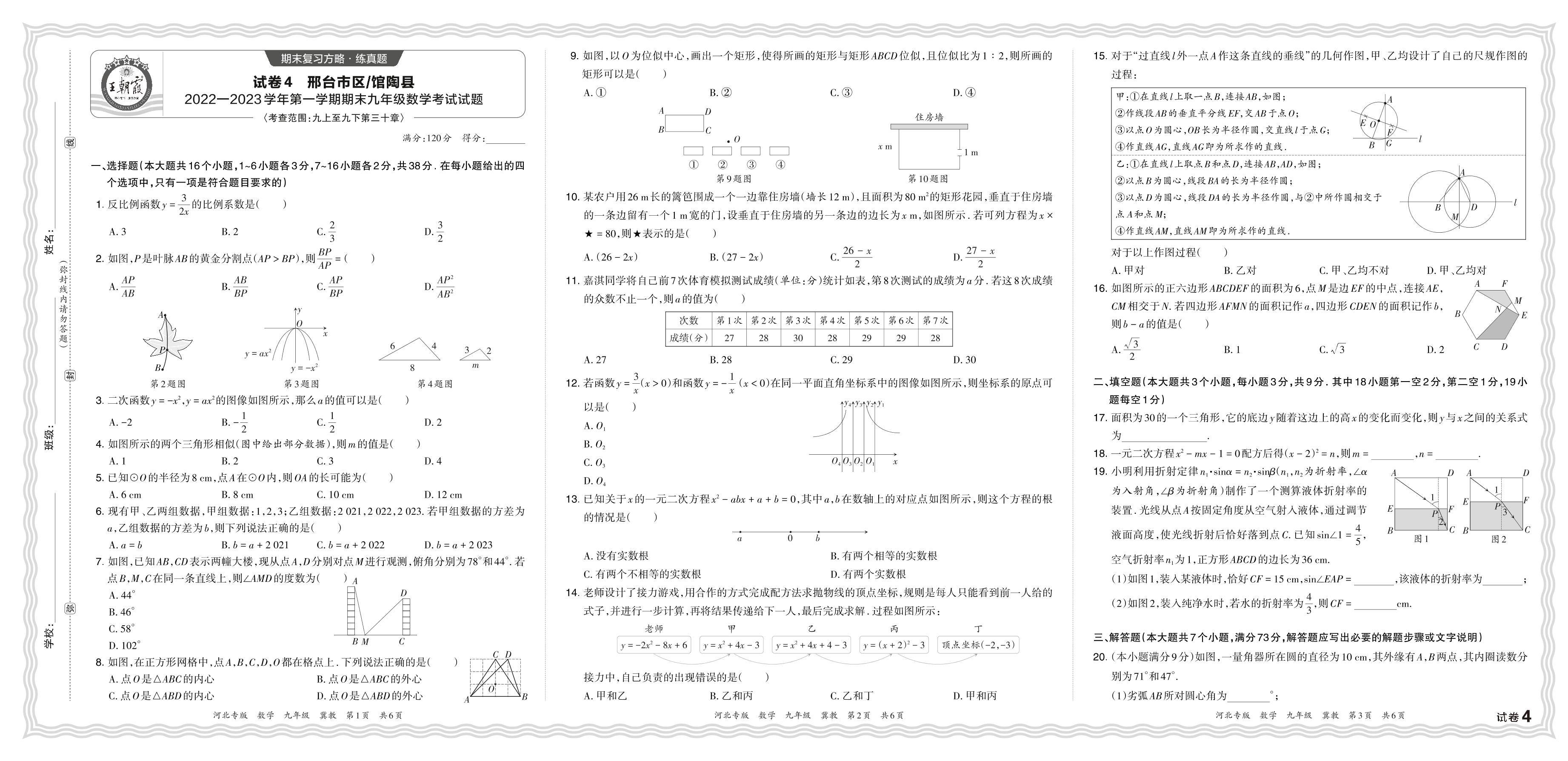 河北省邢台市区、邯郸市馆陶县2022—2023学年第一学期期末九年级数学考试试题(冀教版)【4】