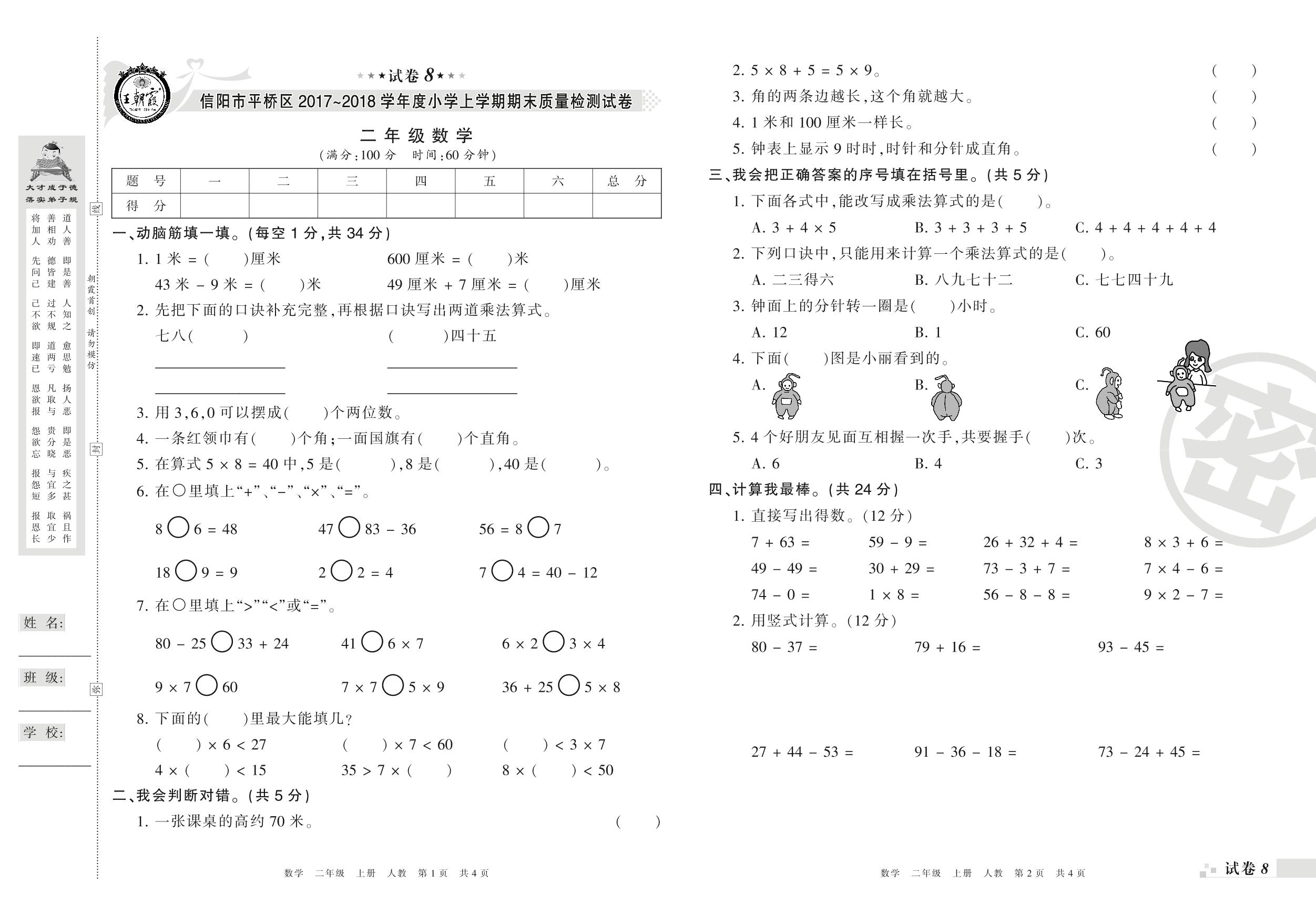 2017-2018学年第一学期信阳市平桥区二年级数学试卷(人教版)【8】