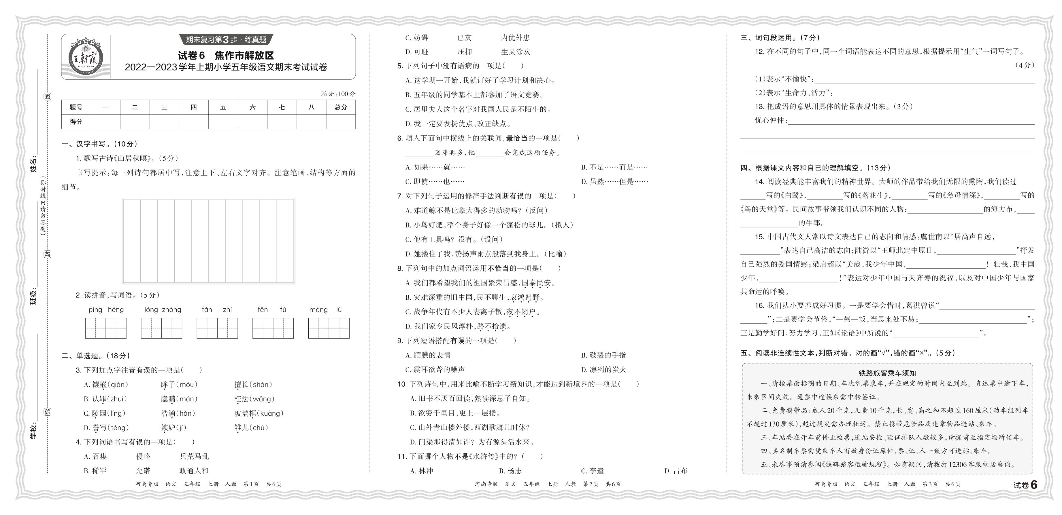 河南省焦作市解放区2022—2023学年上期小学五年级语文期末考试试卷(人教版)【6】