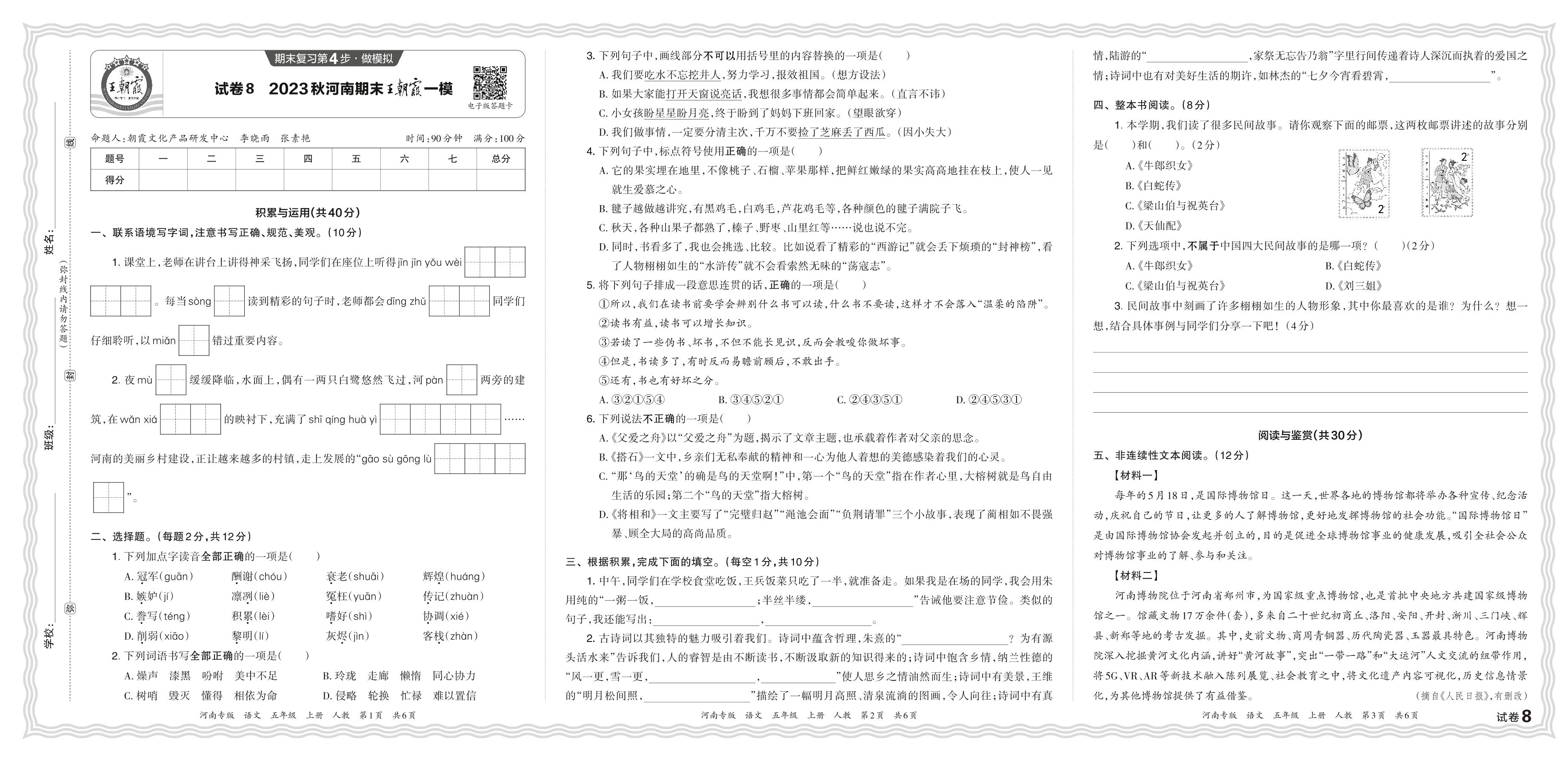 2023秋上册五年级语文人教版 河南期末王朝霞一模【8】