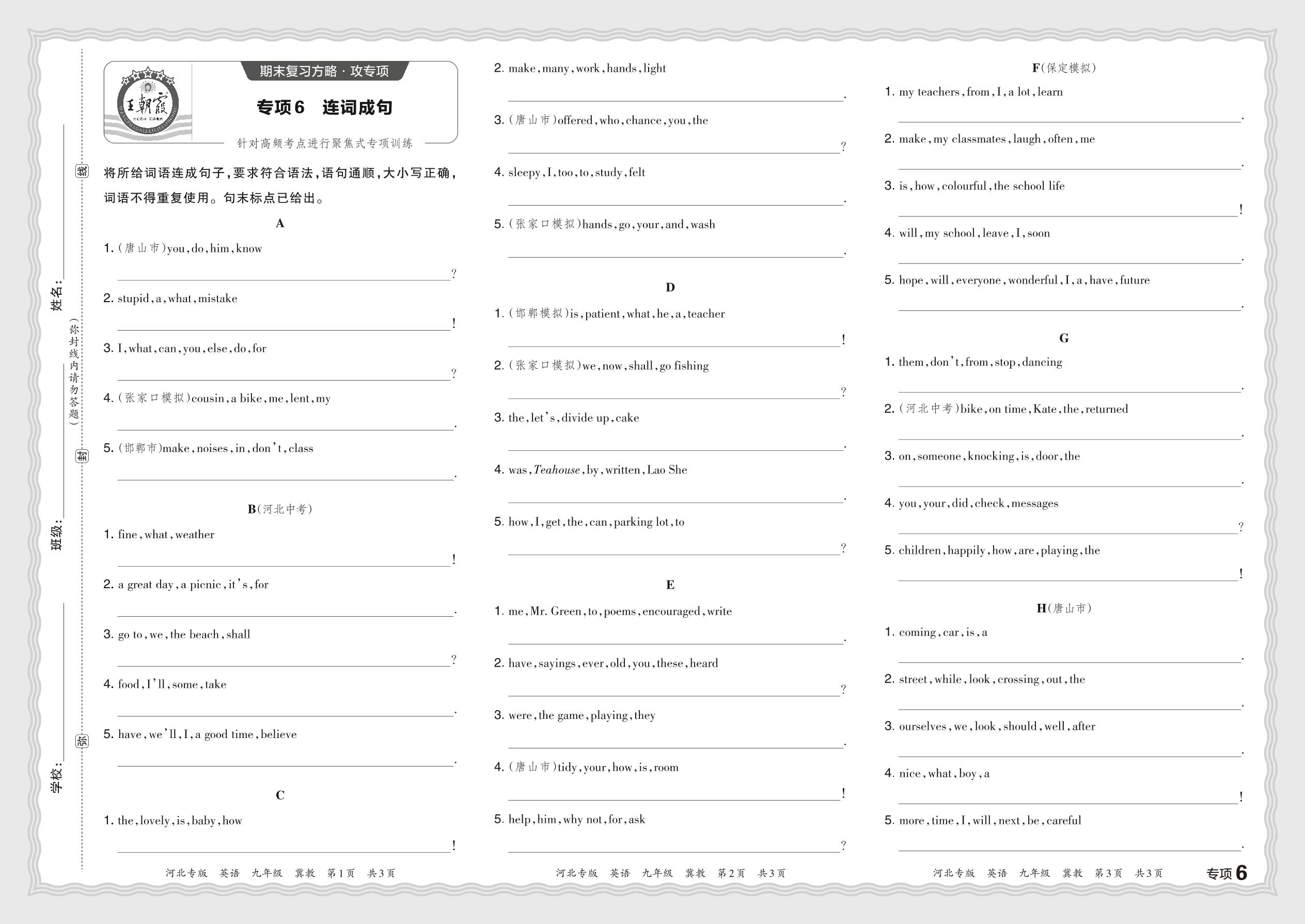 2023秋上册九年级英语冀教版 期末专项卷·连词成句【6】