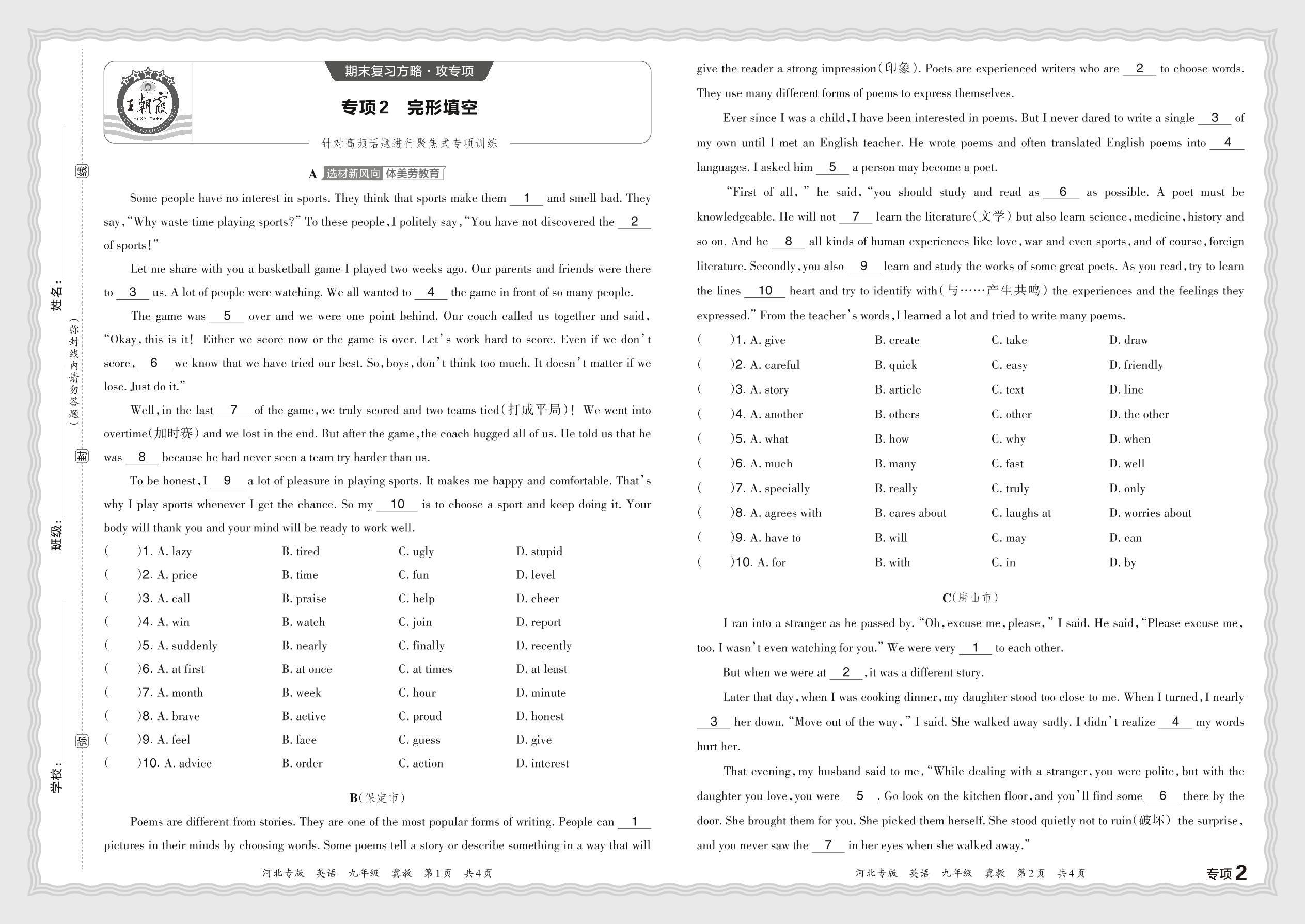 2023秋上册九年级英语冀教版 期末专项卷·完形填空【2】