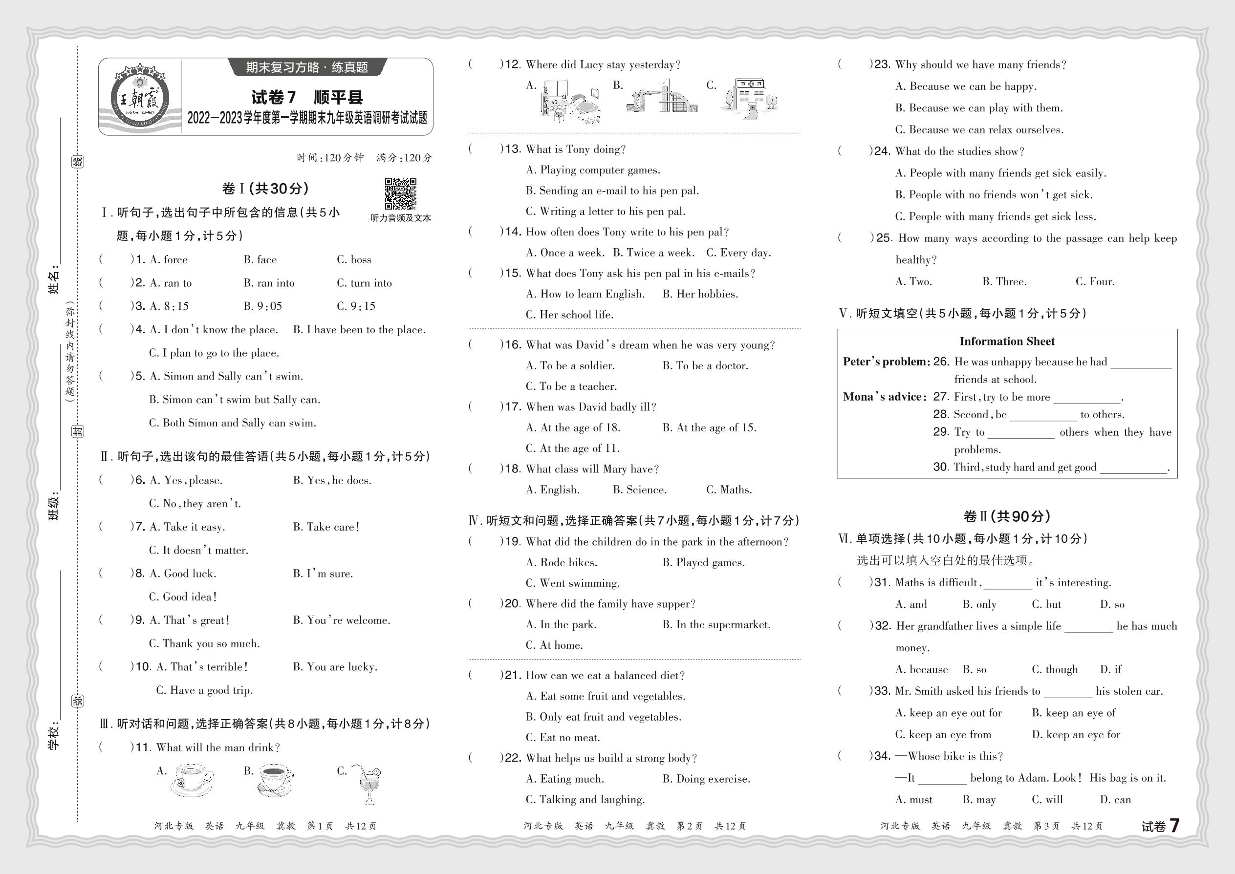 河北省保定市顺平县2022—2023学年度第一学期期未九年级英语调研考试试题(冀教版)【7】