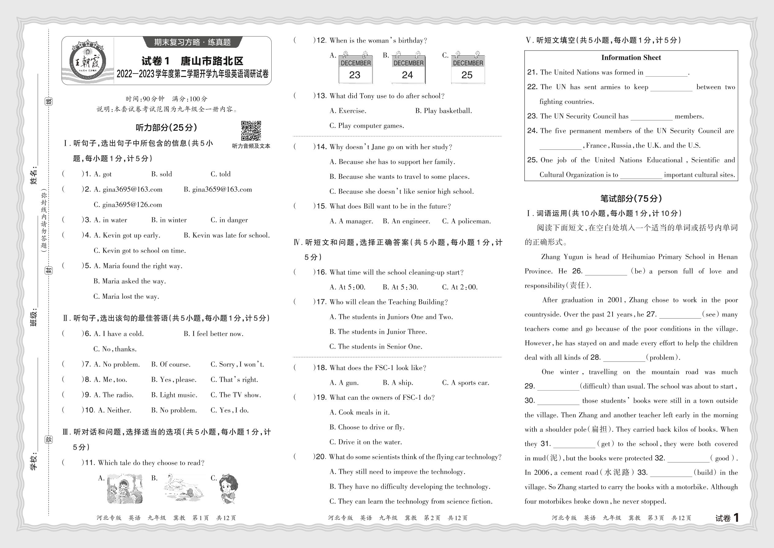 河北省唐山市路北区2022—2023学年度第二学期开学九年级英语调研试卷(冀教版)【1】
