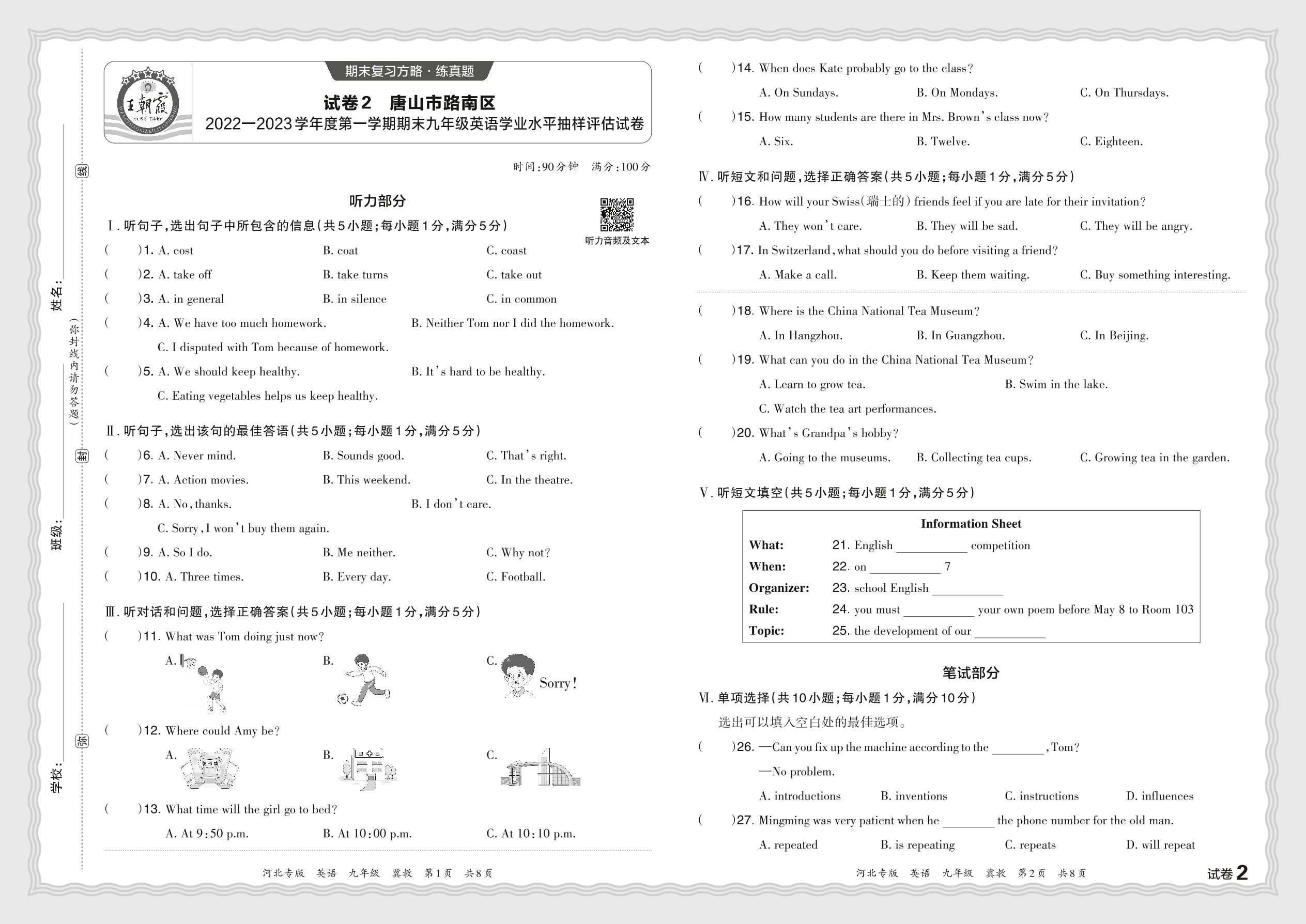 河北省唐山市路南区2022—2023学年度第一学期期末九年级英语学业水平抽样评估试卷(冀教版)【2】