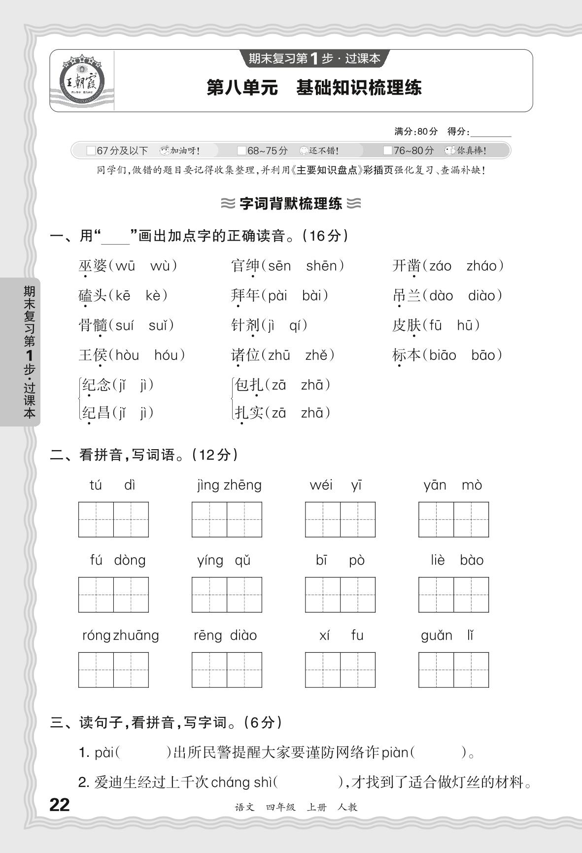 2023秋上册四年级语文人教版 期末过课本QMA版·第八单元 基础知识梳理练
