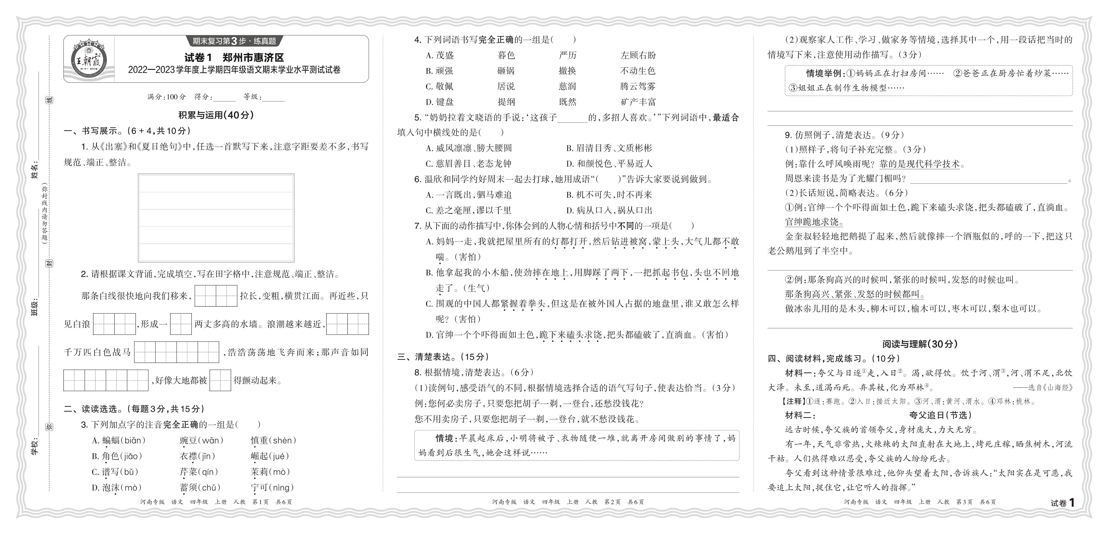 河南省郑州市惠济区2022—2023学年度上学期四年级语文期末学业水平测试试卷(人教版)【1】