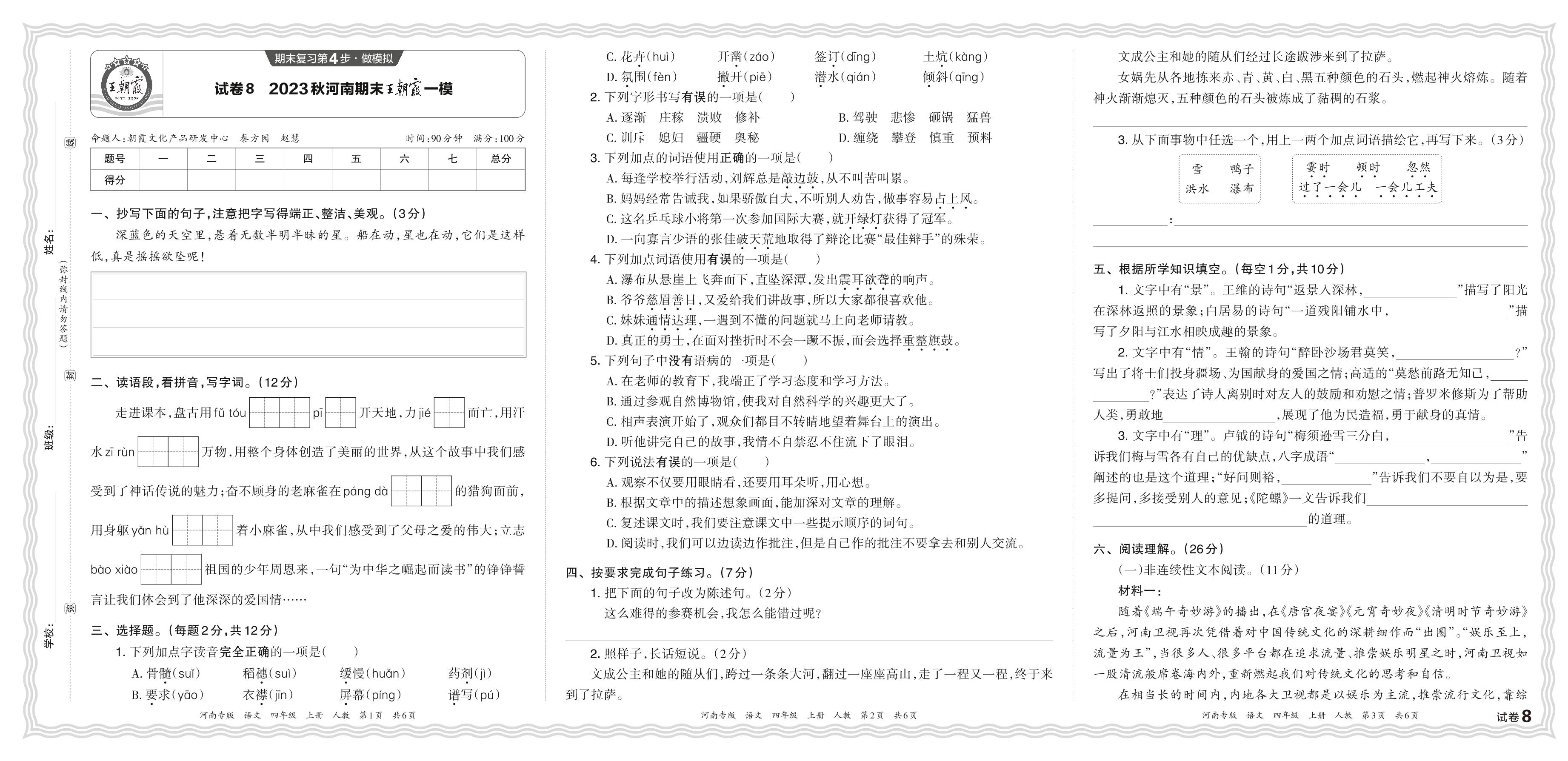 2023秋上册四年级语文人教版 河南期末王朝霞一模【8】
