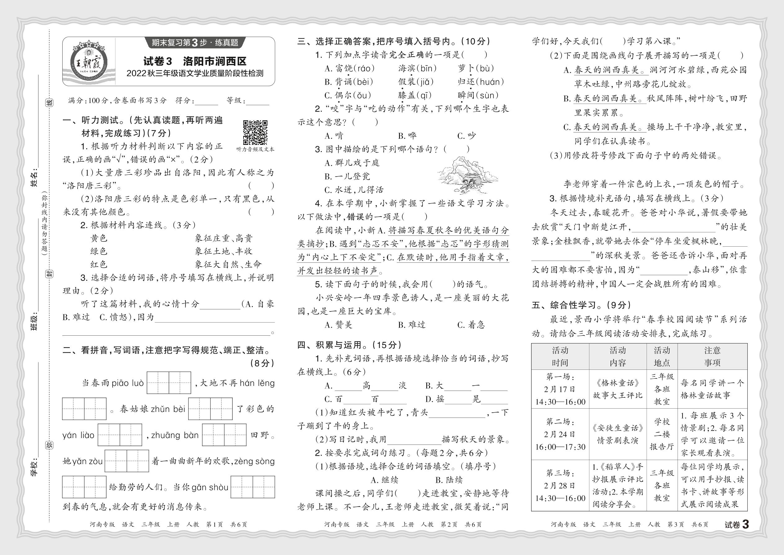 河南省洛阳市涧西区2022秋三年级语文学业质量阶段性检测(人教版)【3】