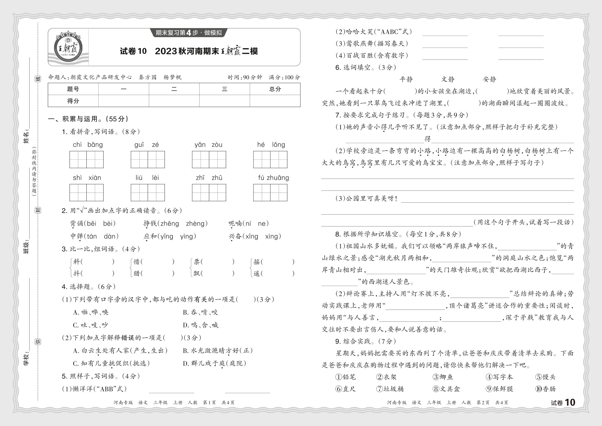 2023秋上册三年级语文人教版 河南期末王朝霞二模【10】
