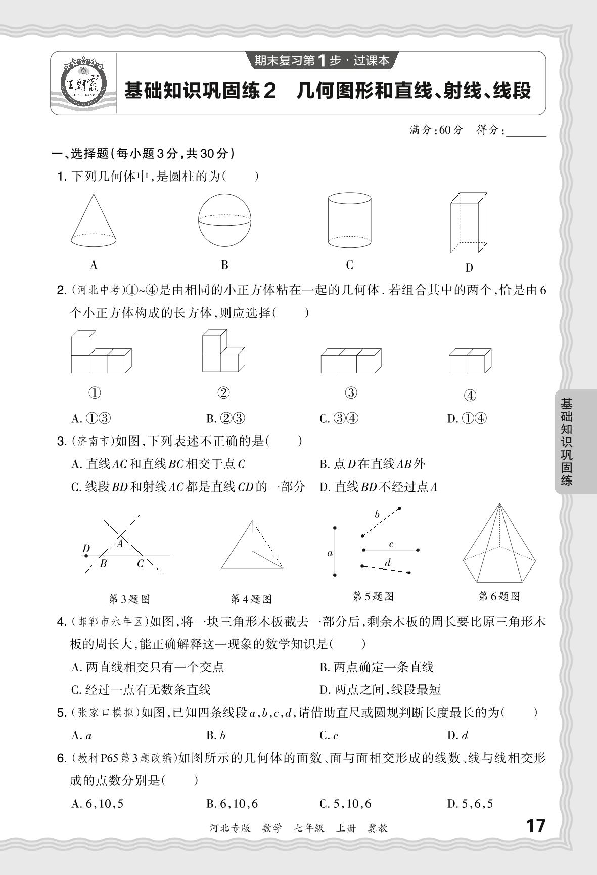 2023秋上册七年级数学冀教版 期末过课本·基础知识巩固练 几何图形和直线、射线、线段【2】