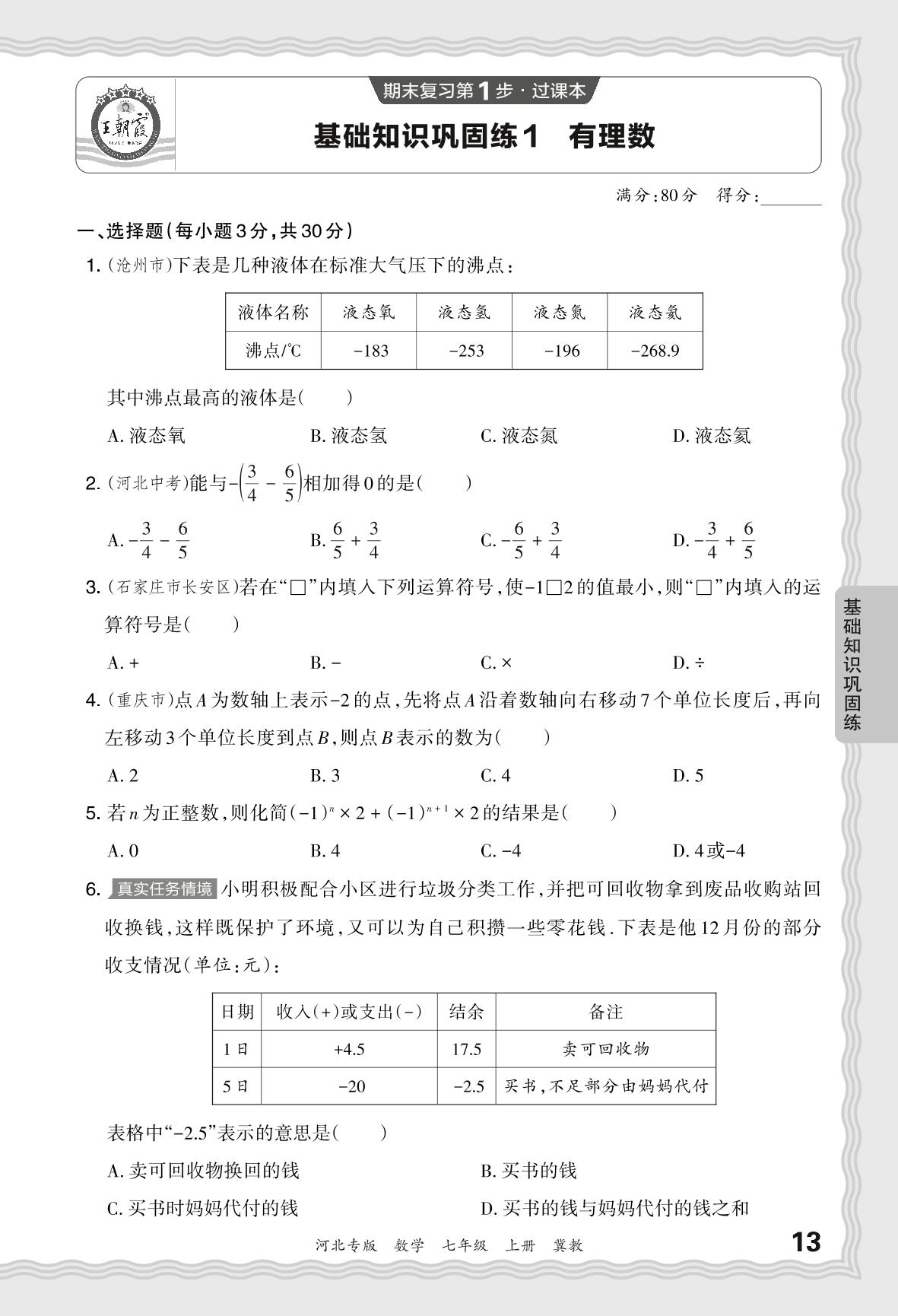 2023秋上册七年级数学冀教版 期末过课本·基础知识巩固练 有理数【1】