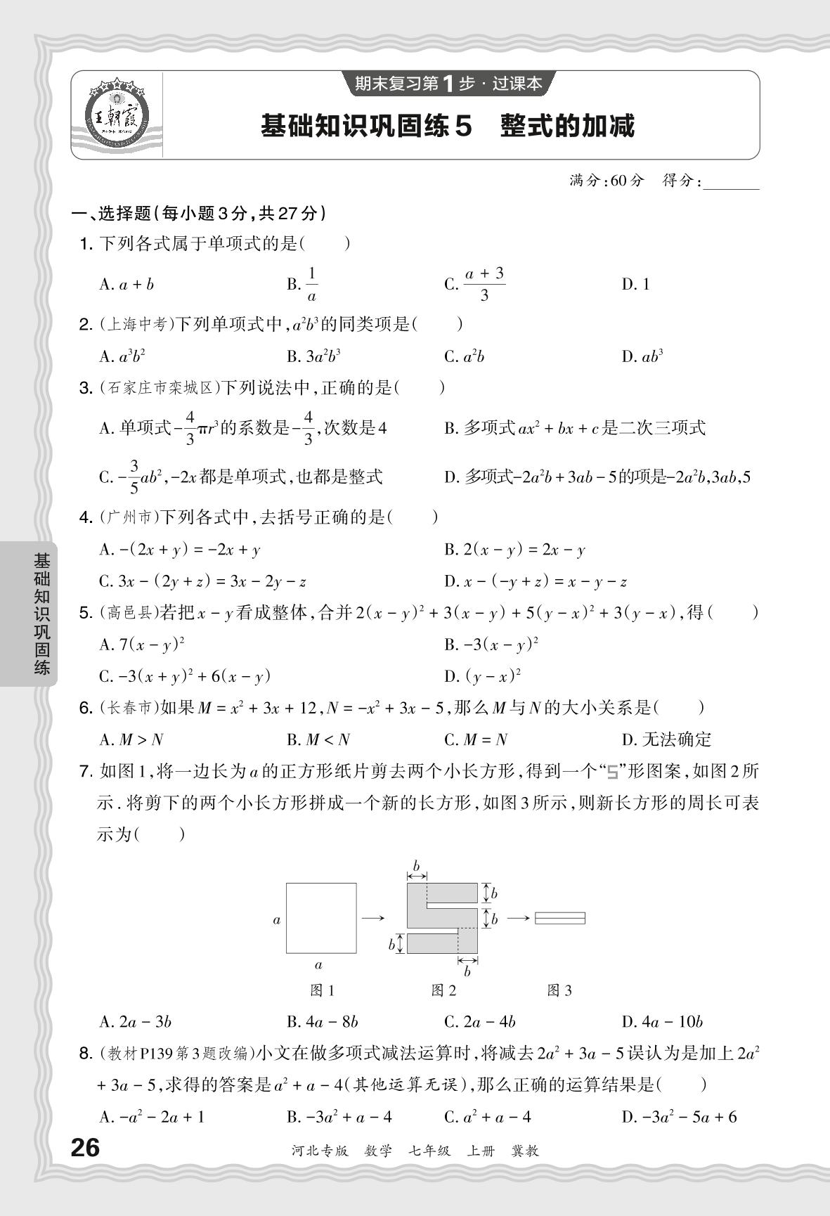 2023秋上册七年级数学冀教版 期末过课本·基础知识巩固练 整式的加减【5】