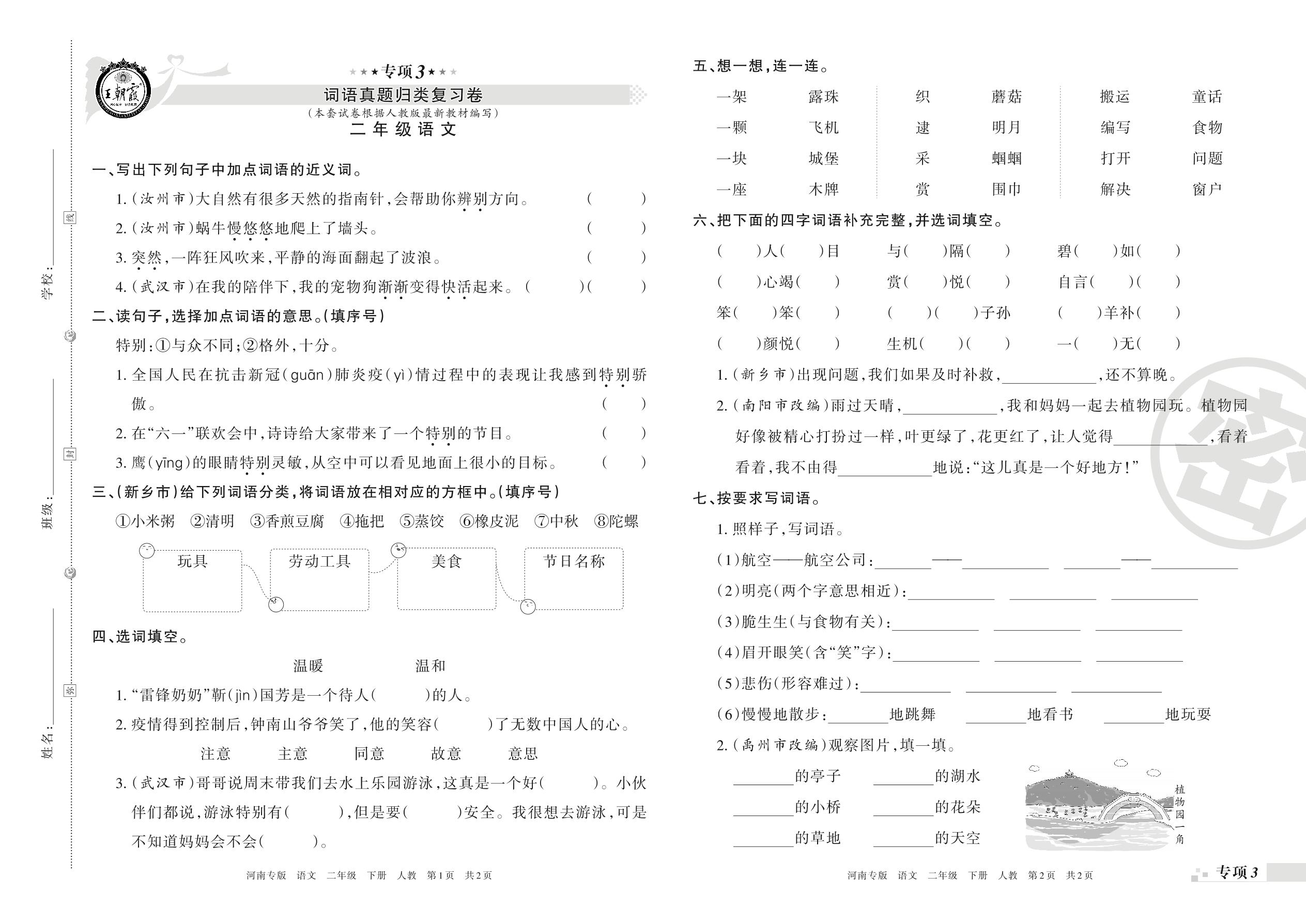 王朝霞期末专项卷——词语、句子与口语交际真题归类复习二年级下册语文(人教版)【0】