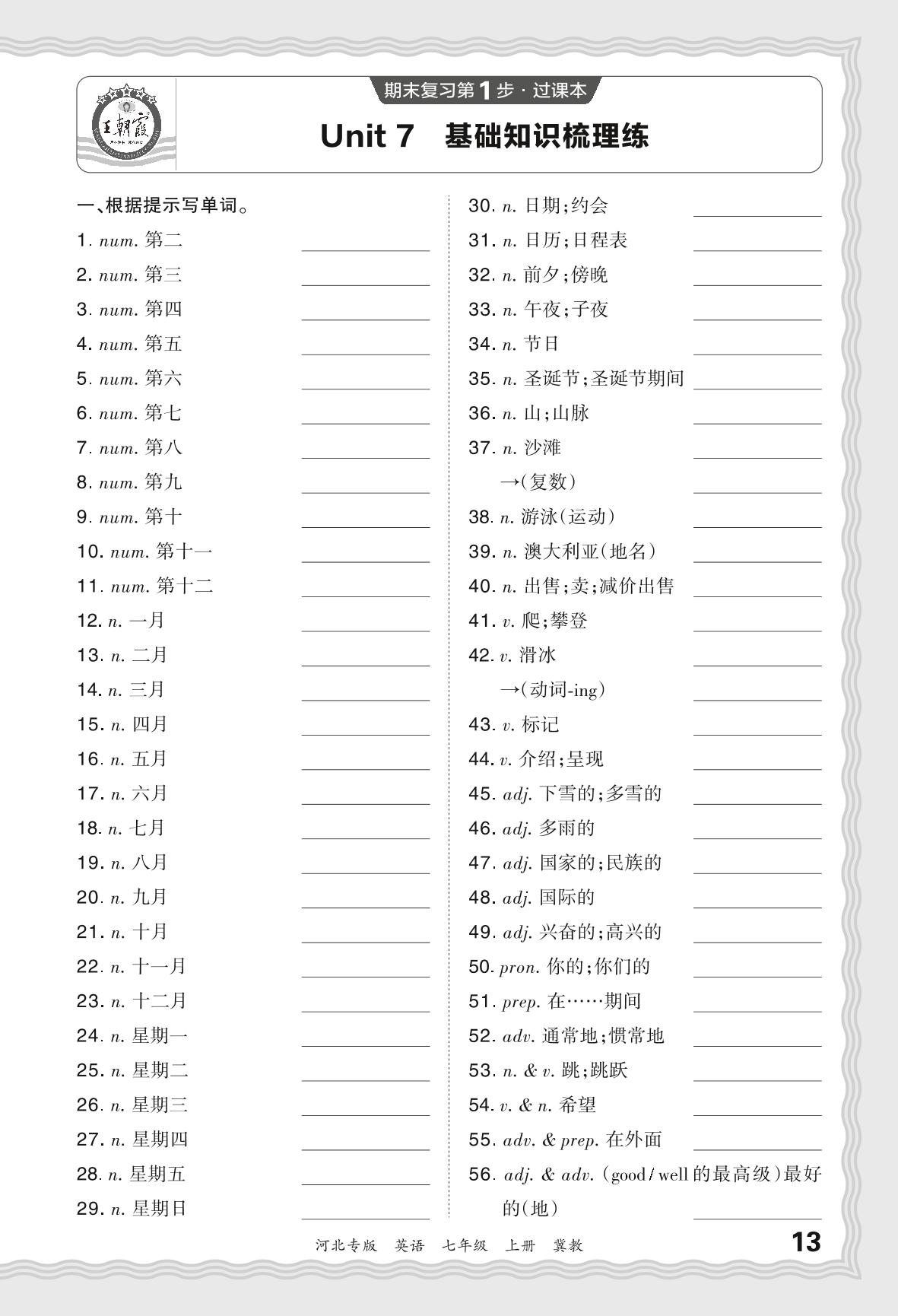 2023秋上册七年级英语冀教版 期末过课本·Unit 7 基础知识梳理练