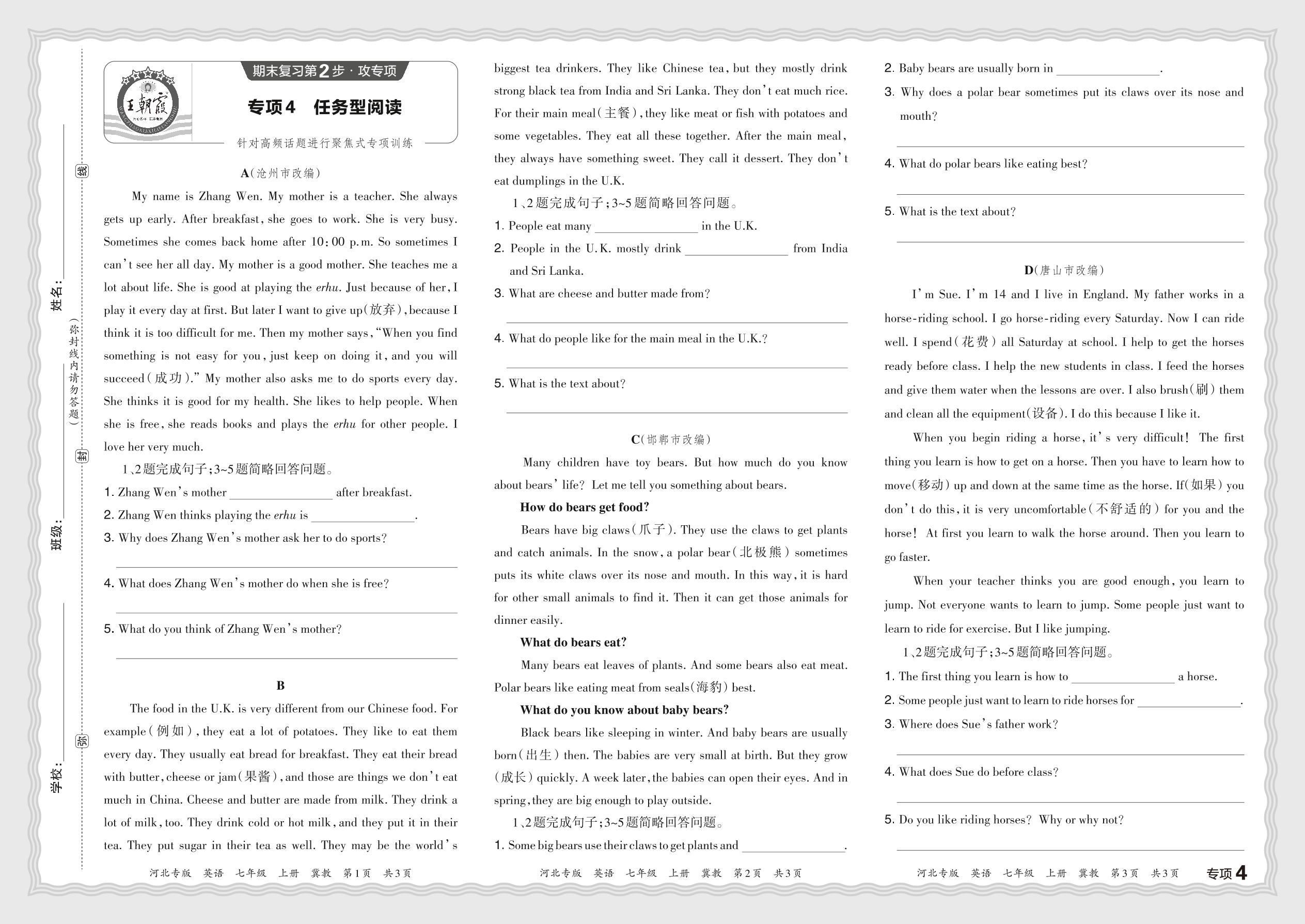 2023秋上册七年级英语冀教版 期末专项卷·任务型阅读【4】