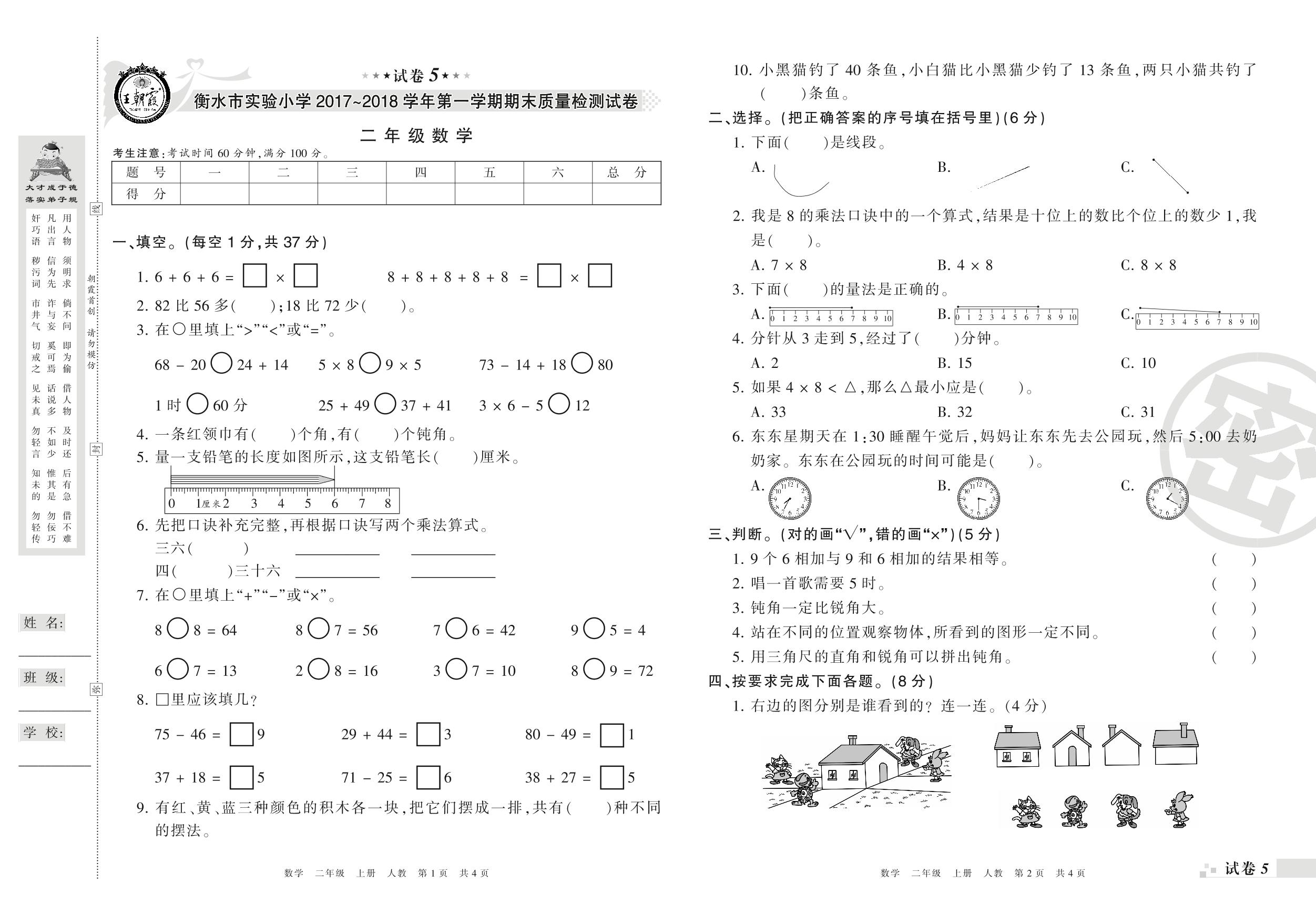 2017-2018学年第一学期衡水市实验小学二年级数学试卷(人教版)【5】
