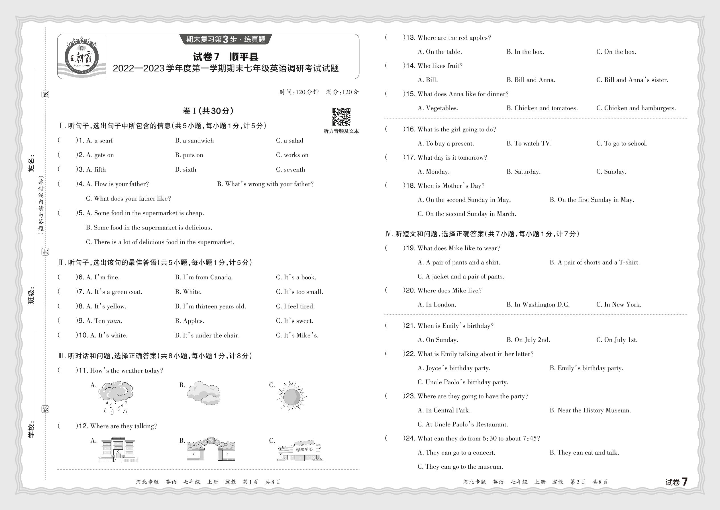 河北省保定市顺平县2022—2023学年度第一学期期末七年级英语调研考试试题(冀教版)【7】