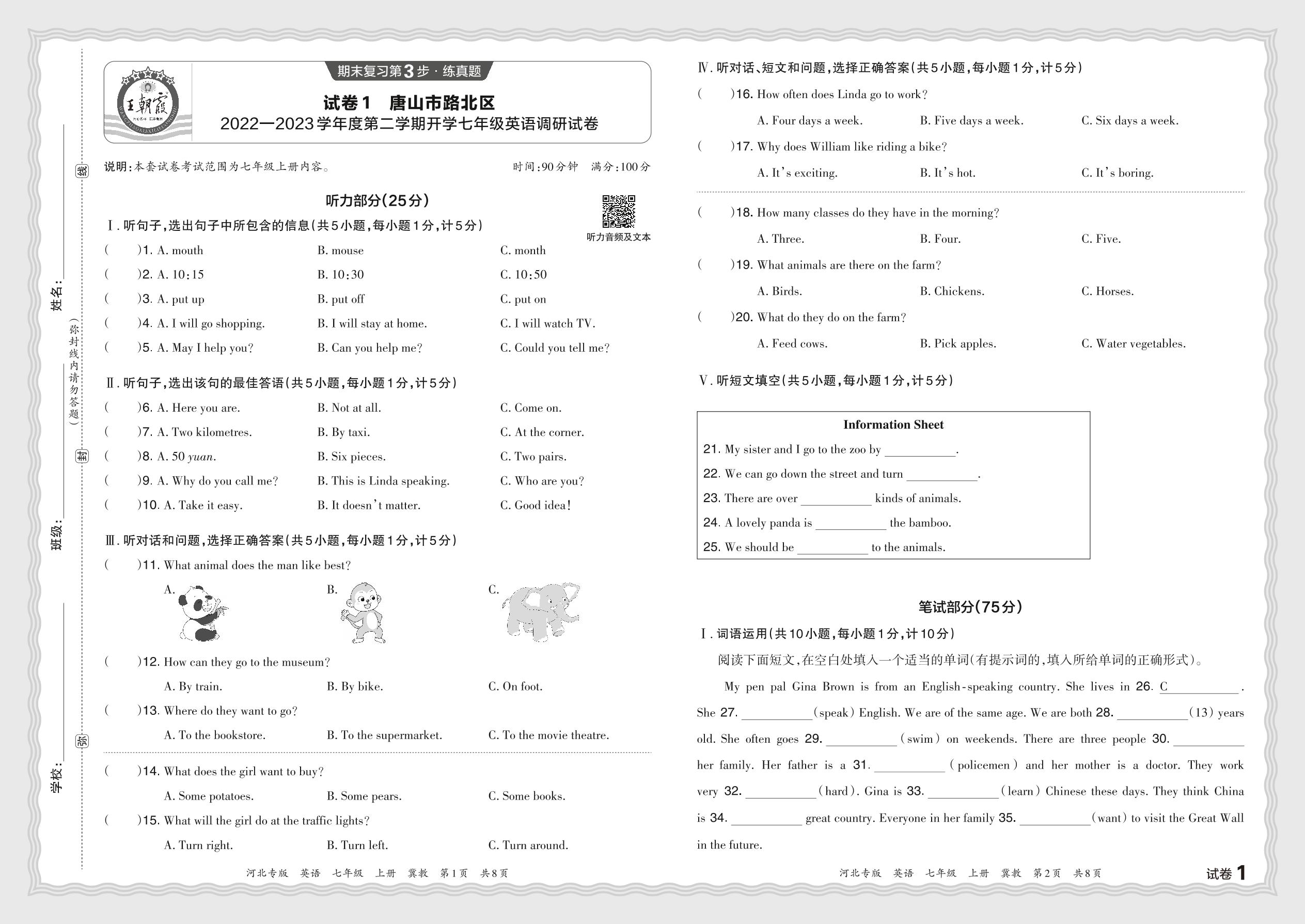 河北省唐山市路北区2022—2023学年度第二学期开学七年级英语调研试卷(冀教版)【1】