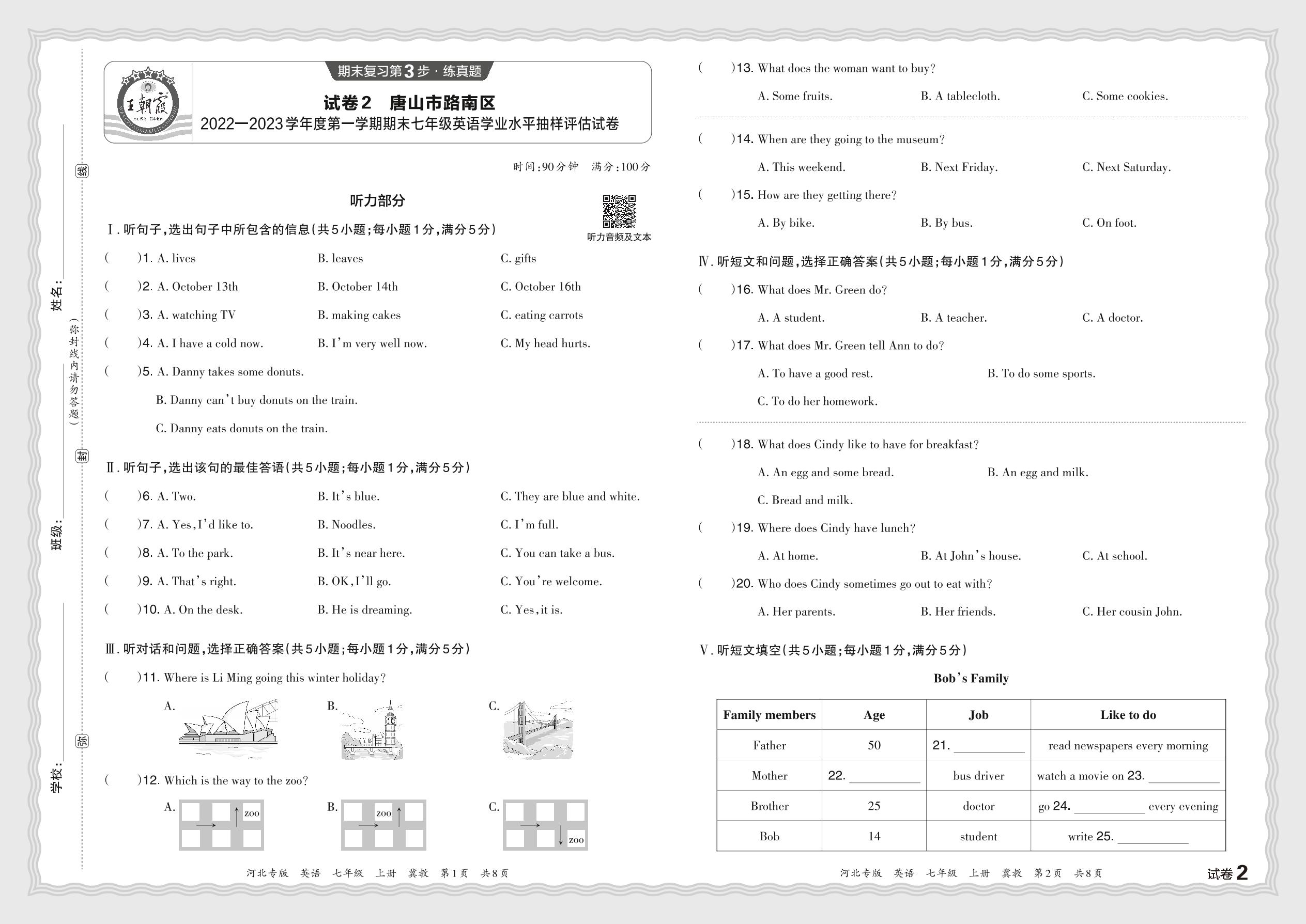河北省唐山市路南区2022—2023学年度第一学期期末七年级英语学业水平抽样评估试卷(冀教版)【2】