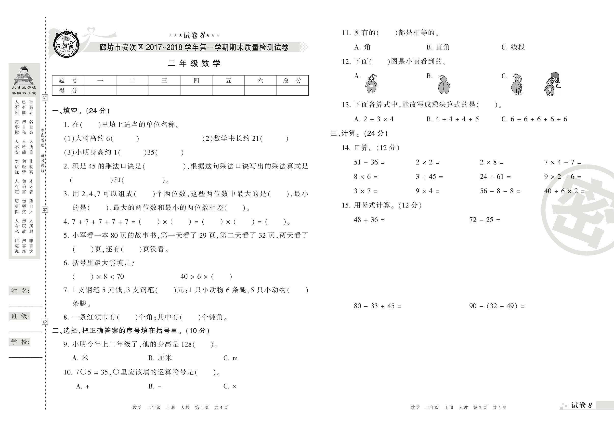2017-2018学年第一学期廊坊市安次区二年级数学试卷(人教版)【8】