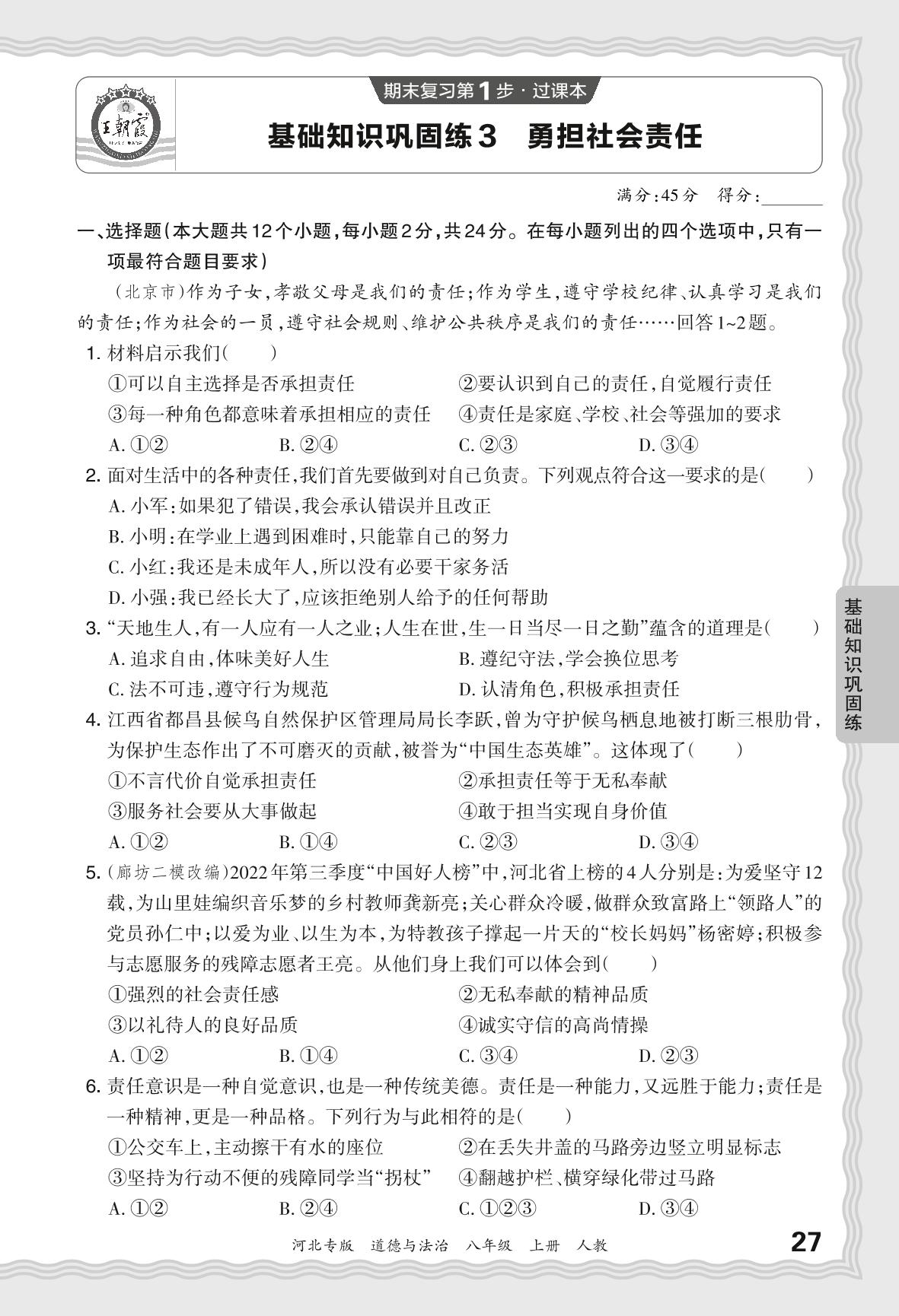 2023秋上册八年级道德与法治人教版 期末过课本·基础知识巩固练 勇担社会责任【3】