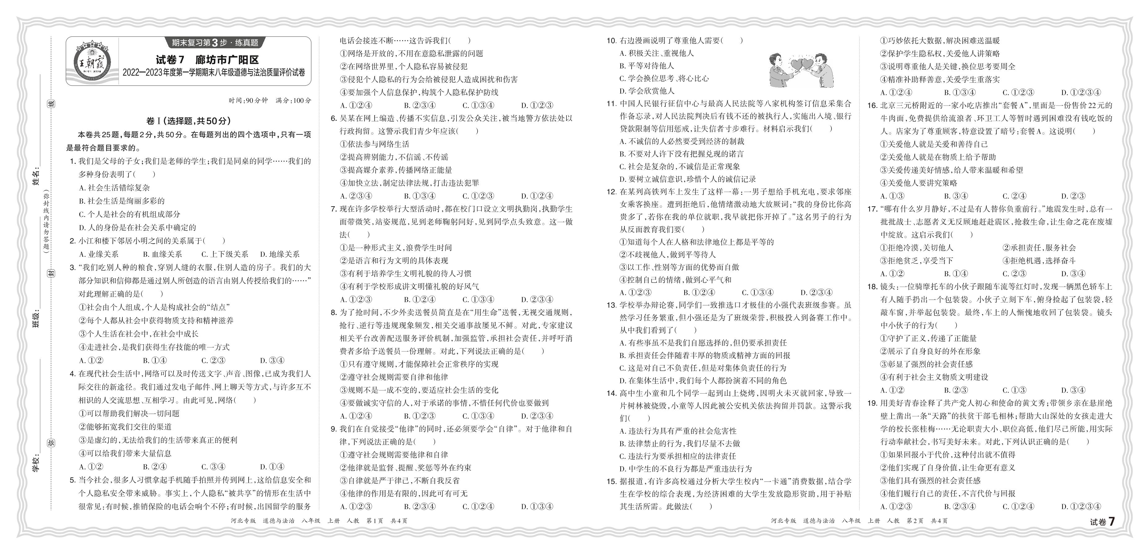 河北省廊坊市广阳区2022—2023年度第一学期期末八年级道德与法治质量评价试卷(人教版)【7】