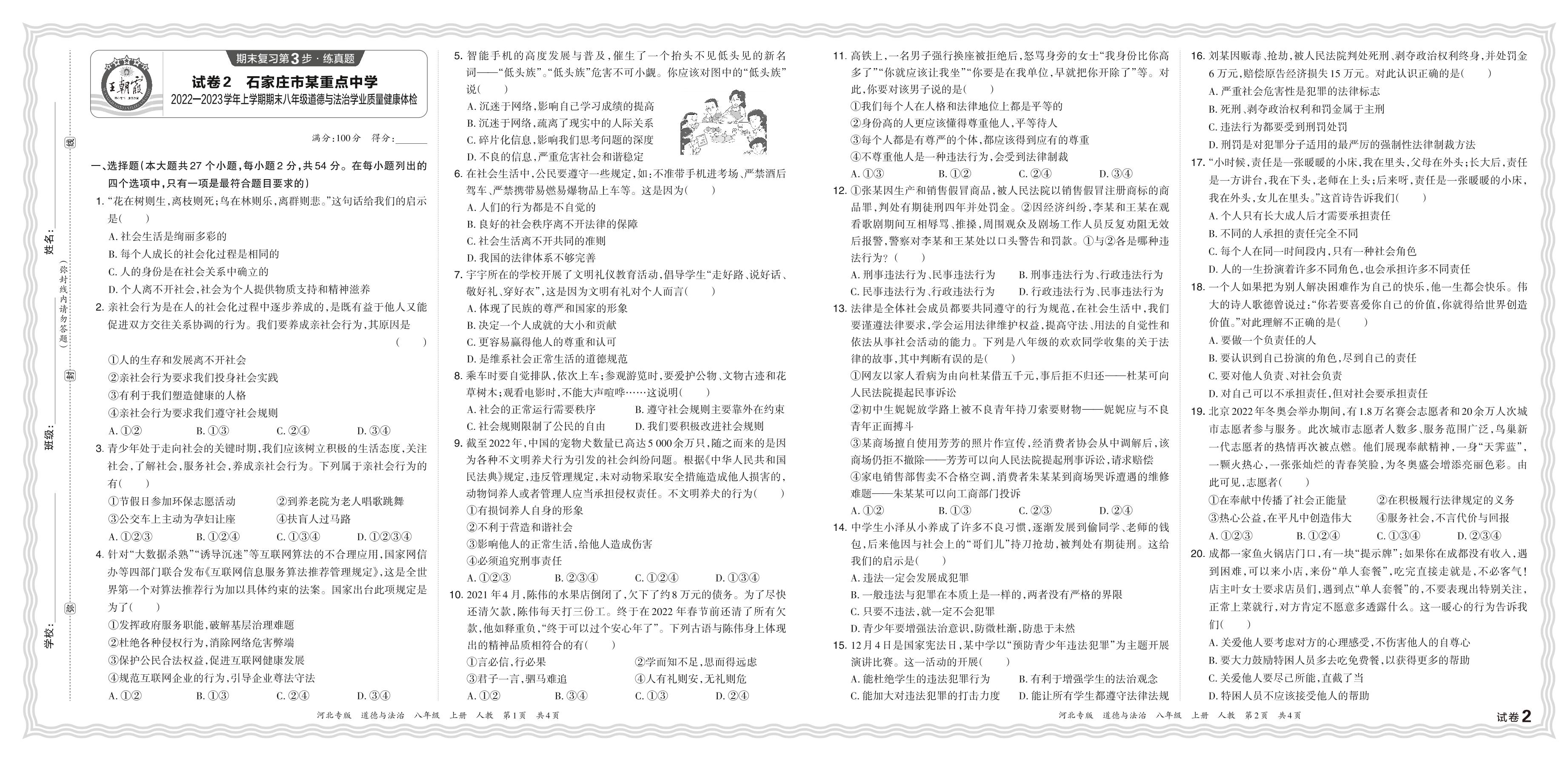 河北省石家庄市某重点中学2022—2023学年上学期期末八年级道德与法治学业质量健康体检(人教版)【2】
