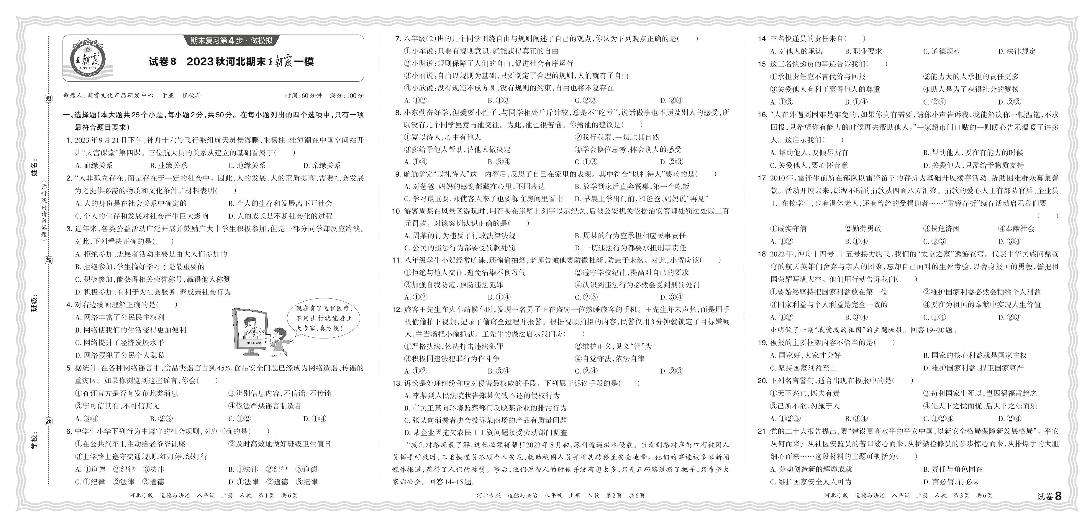 2023秋上册八年级道德与法治人教版 河北期末王朝霞一模