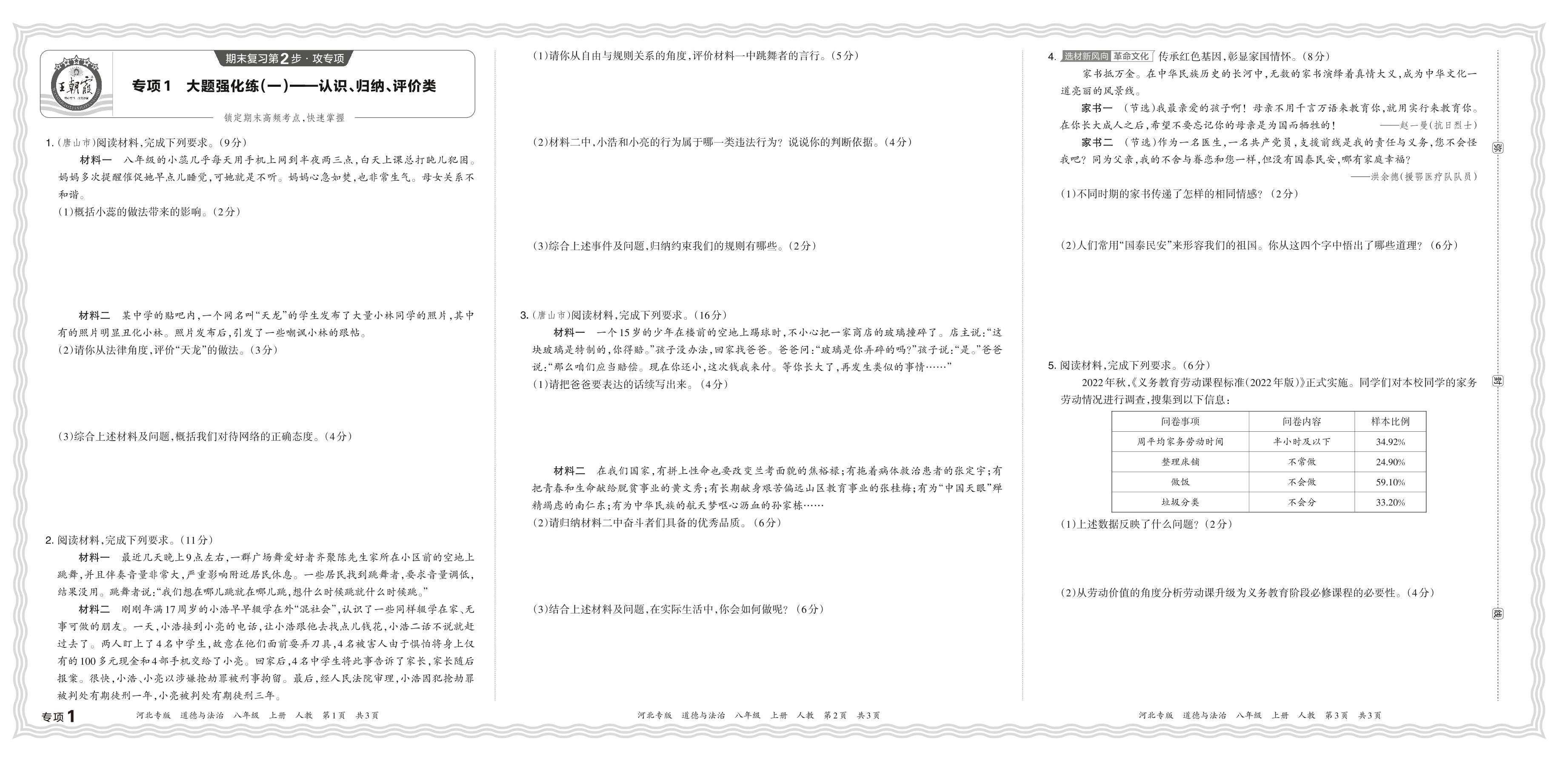 2023秋上册八年级道德与法治人教版 期末专项卷·大题强化练一——认识、归纳、评价类