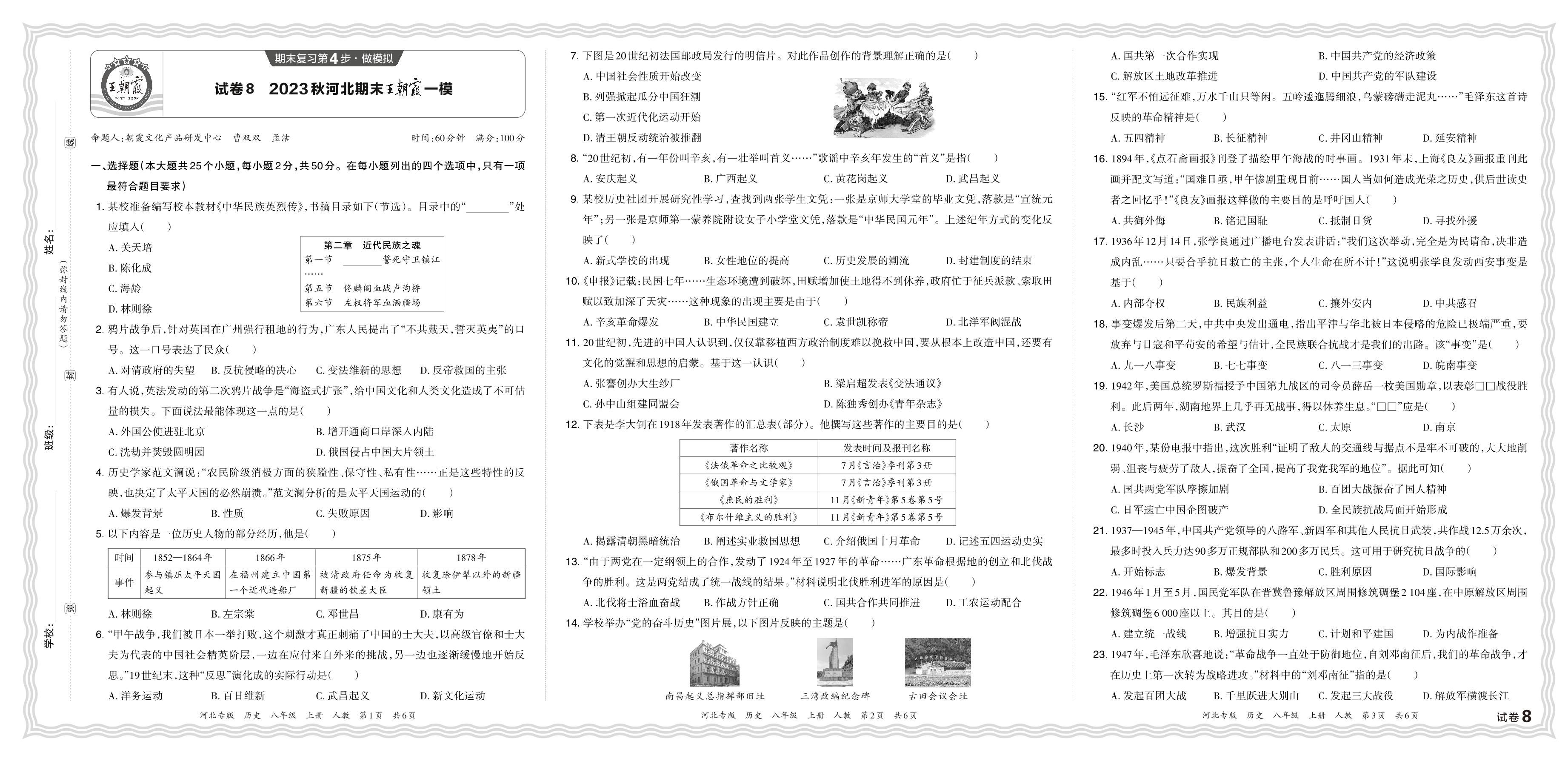 2023秋上册八年级历史人教版 河北期末王朝霞一模