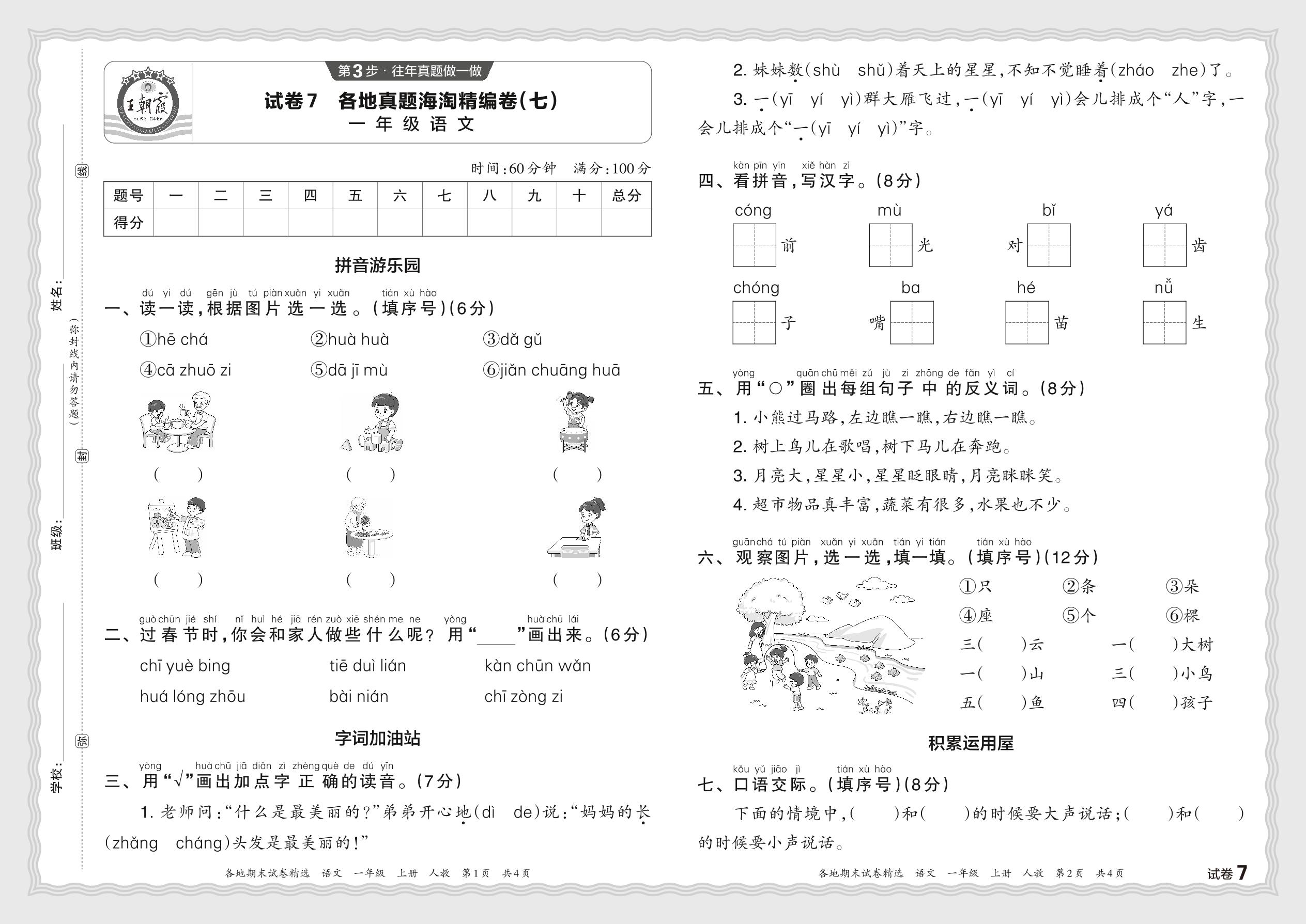 2023秋上册一年级语文人教版 各地真题海淘精编卷(七)JX