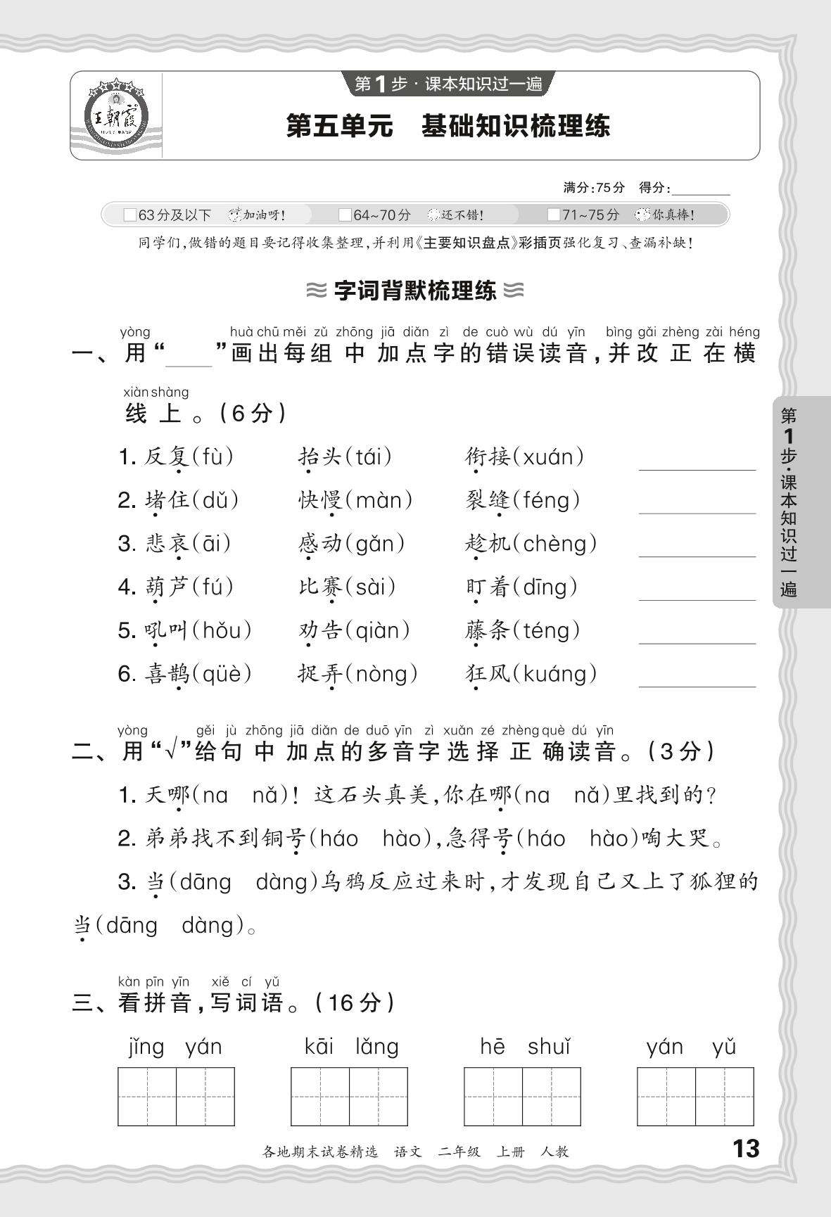 2023秋上册二年级语文人教版 期末过课本JX版·第五单元 基础知识梳理练