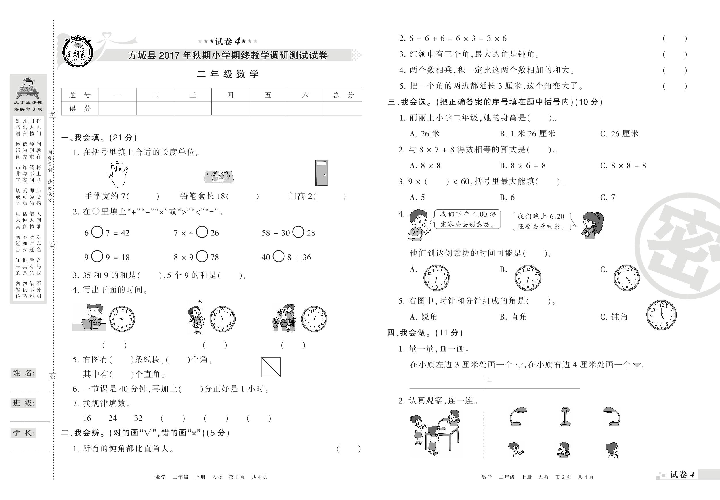 2017-2018学年第一学期南阳市方城县二年级数学试卷(人教版)【4】
