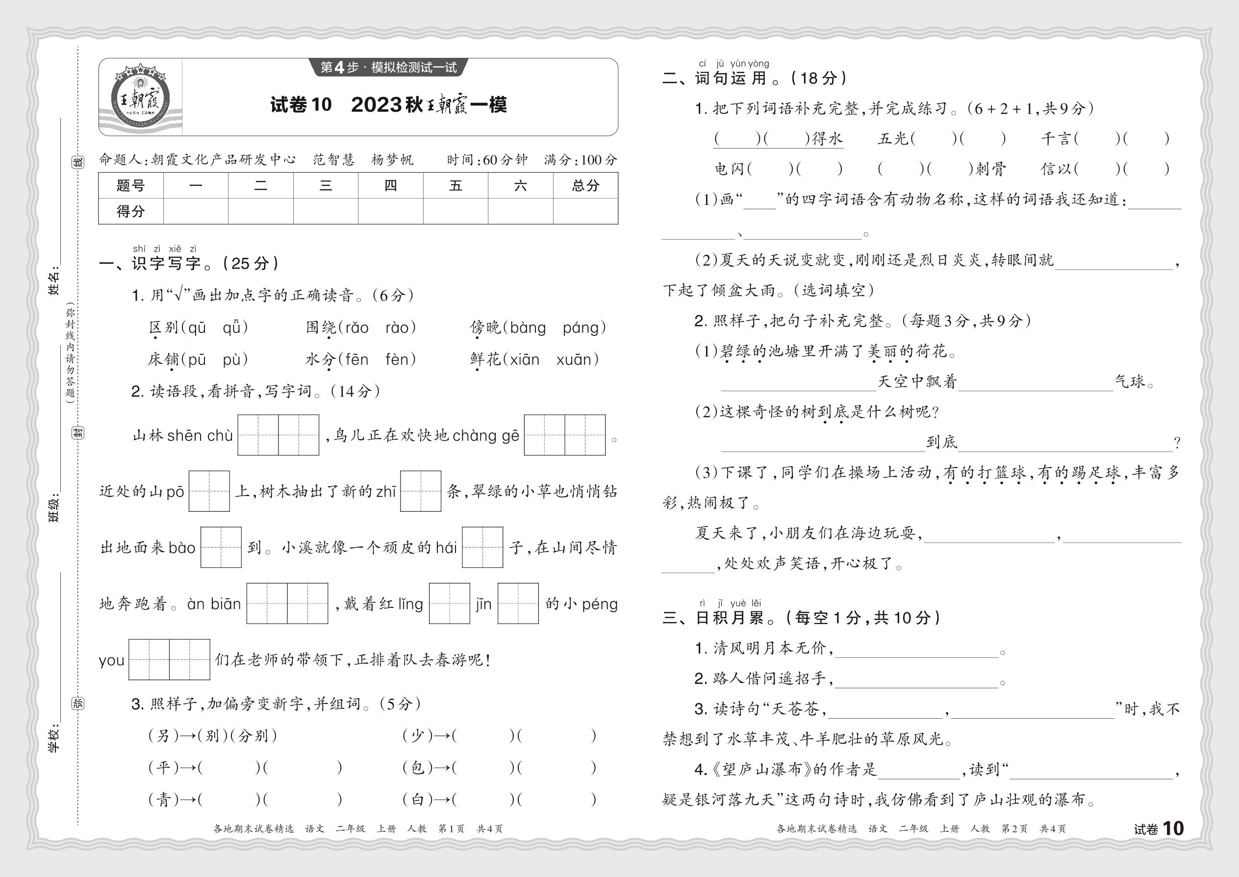 2023秋上册二年级语文人教版 王朝霞一模JX