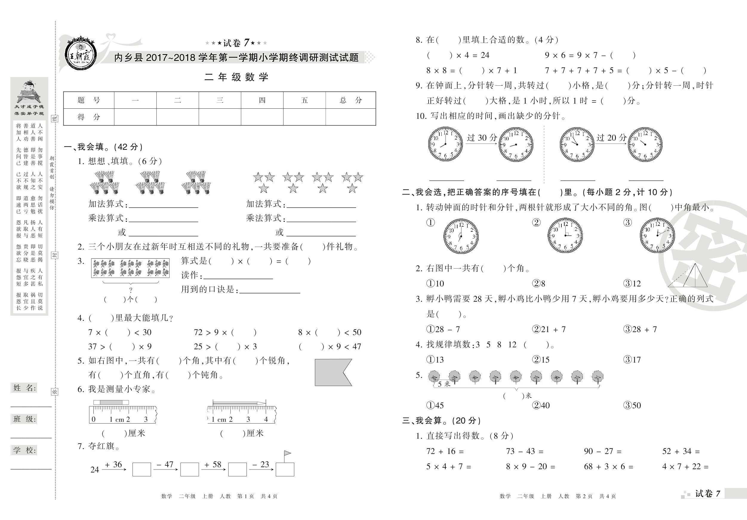 2017-2018学年第一学期南阳市内乡县二年级数学试卷(人教版)【7】