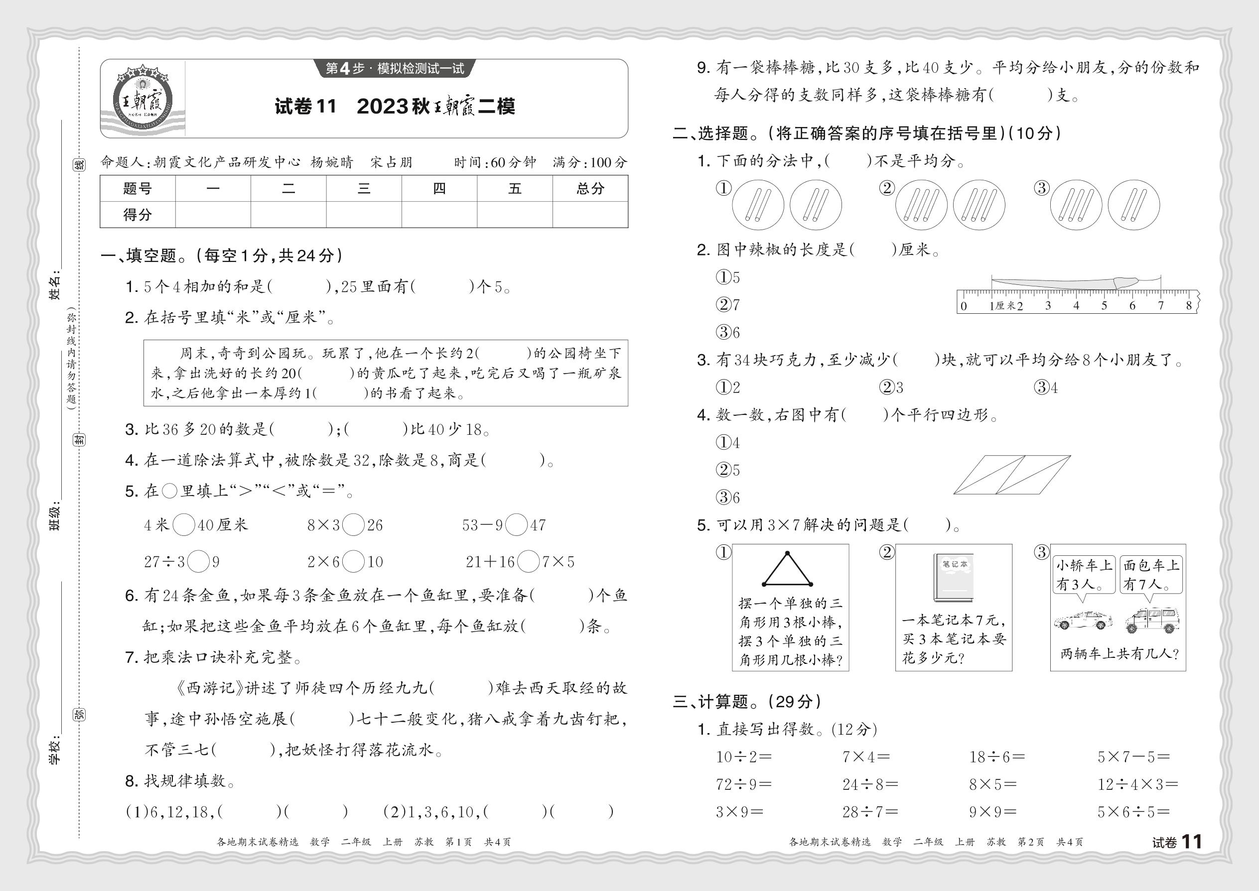 2023秋上册二年级数学苏教版 王朝霞二模JX