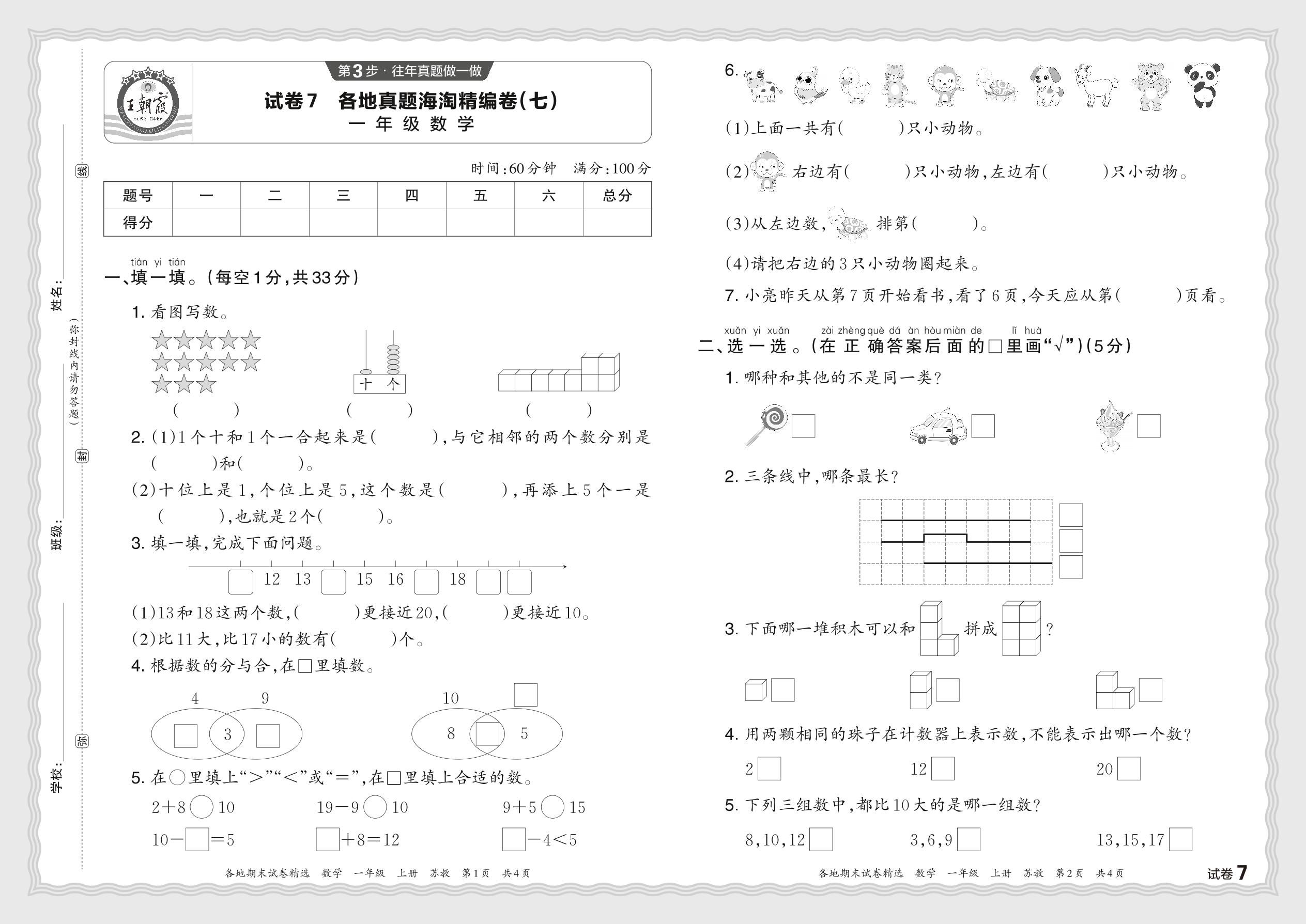 2023秋上册一年级数学苏教版 各地真题海淘精编卷(七)JX