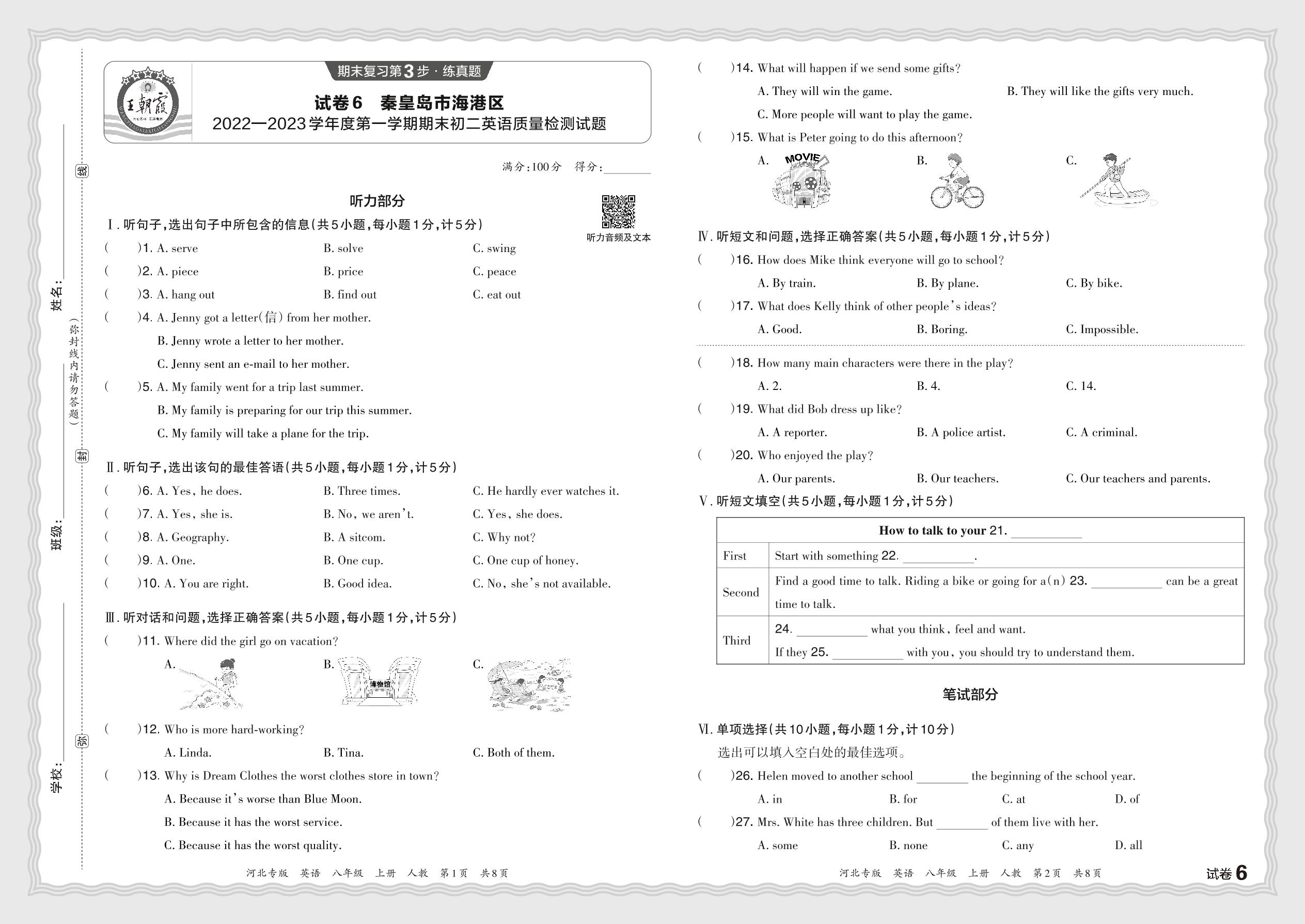 河北省秦皇岛市海港区2022—2023学年度第一学期期末初二英语质量检测试题(人教版)【6】